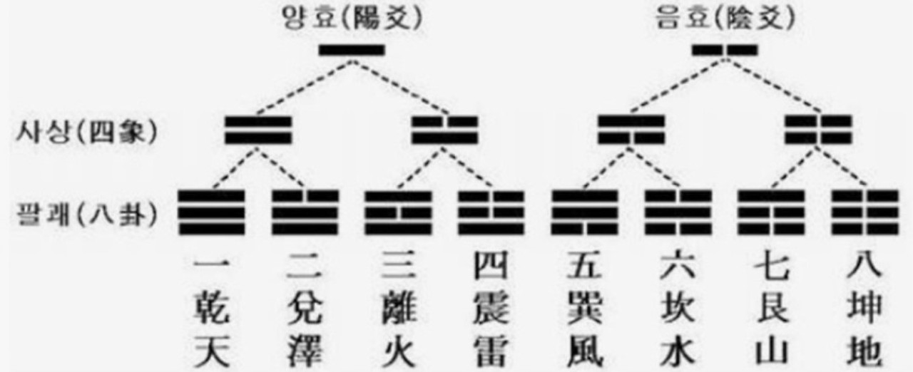 이 4형태인 4상이 다시 음양의 변화를 겪어서양양양/양양음, 양음양/양음음, 음양양/음양음, 음음양/음음음의 8괘 모양을 얻게 된다.