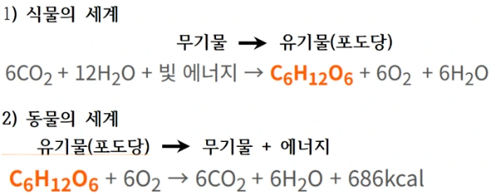 식물의 화학식은 최초 유기물을 만든 어떤 세포에서 일어났던 일을 도식화한 것이다. 먼 옛날, 인간이 도저히 숨을 쉴 수 없는 이산화탄소와 질소가 가득했고, 산소는 희박했던 시기, 지구에서 가장 흔한 이산화탄소CO2와 물H2O을 햇빛이 주관하여 최초 유기물인 포도당C6H12O6이 만들어진다.