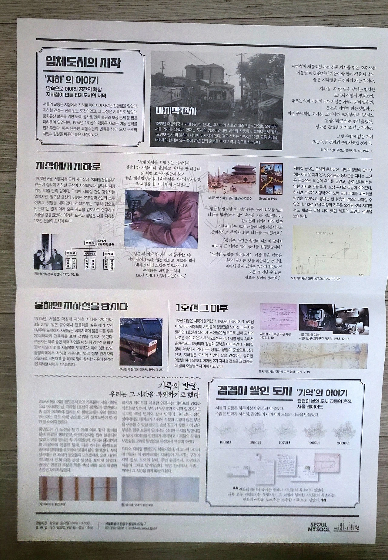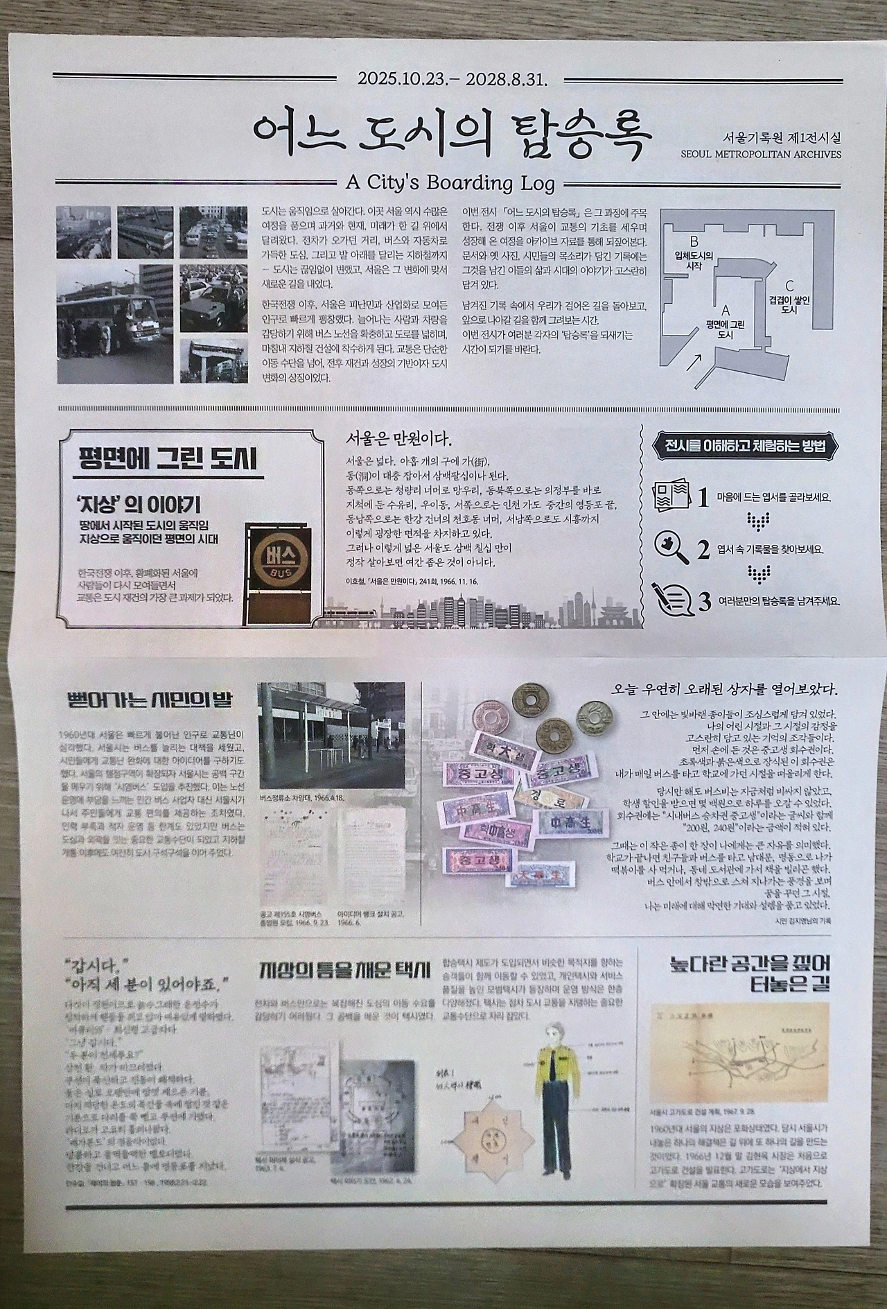 마치 이 오래된 신문지 형태의 '어느 도시의 탑승록'처럼, 과거의 버스 정류장, 택시, 지하철 1호선의 풍경과 설계도를 현재의 우리에게 생생하게 전달하죠.
