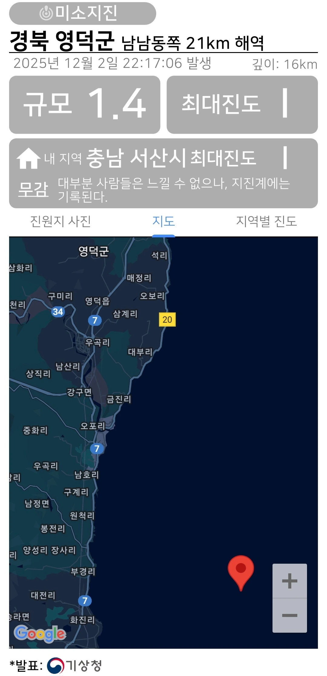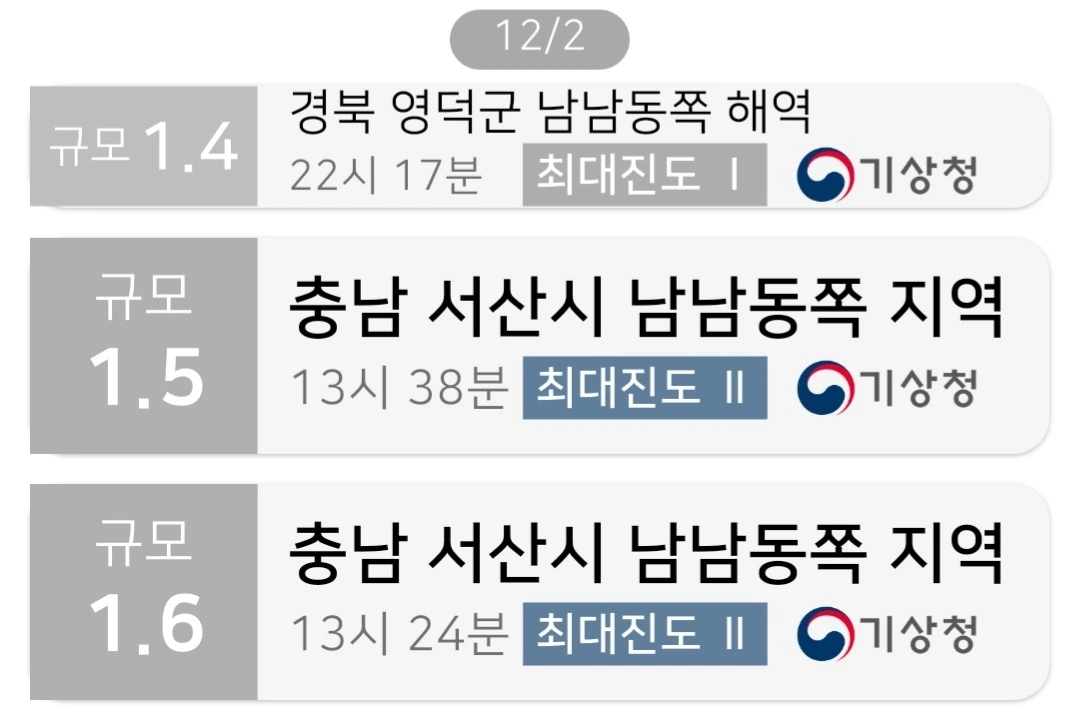 바로 (12월 2일), 충남 서산시와 경북 영덕군 해역에서 포착된 작은 떨림처럼 말이죠.