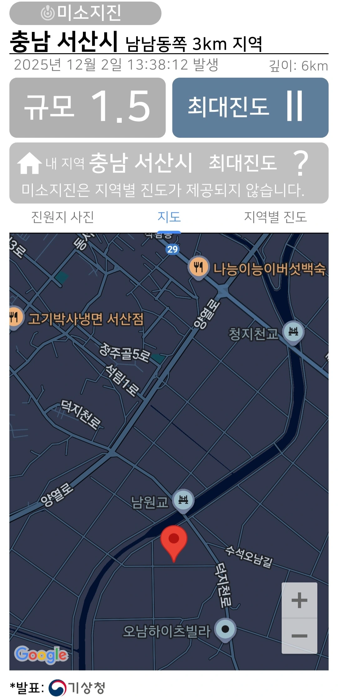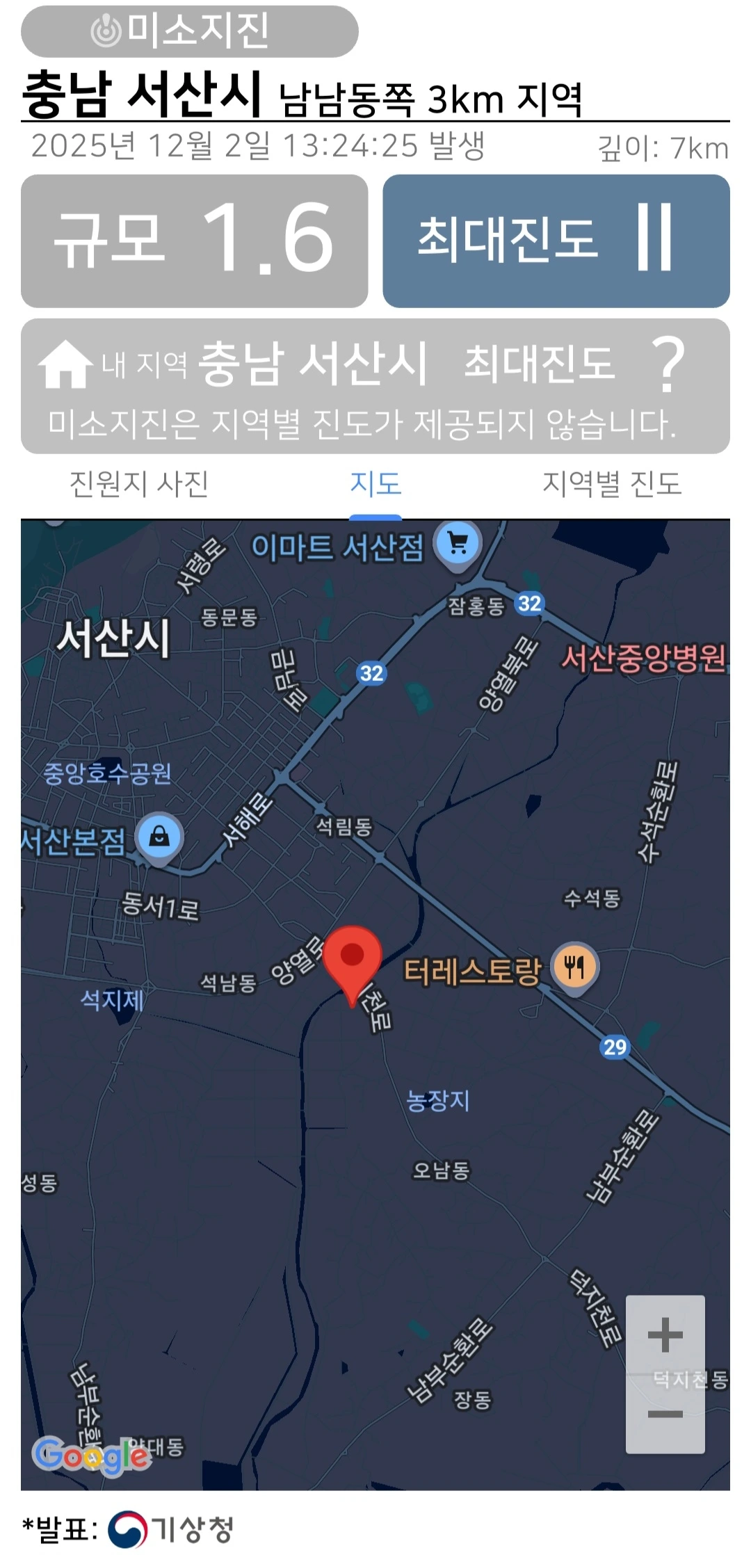 특히 충남 서산시 남남동쪽에서 오후 1시 24분(규모 1.6)과 1시 38분(규모 1.5)에 연이어 미소지진이 발생한 것은, 이 지역 지하 구조가 활발하게 움직이고 있음을 보여줍니다.