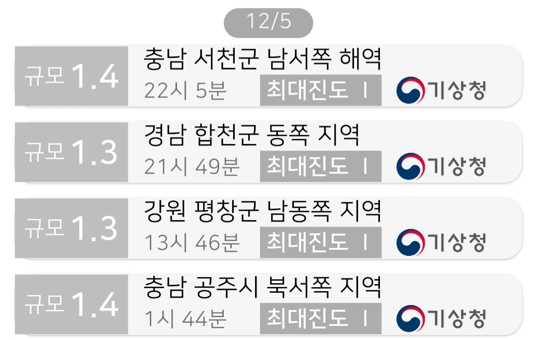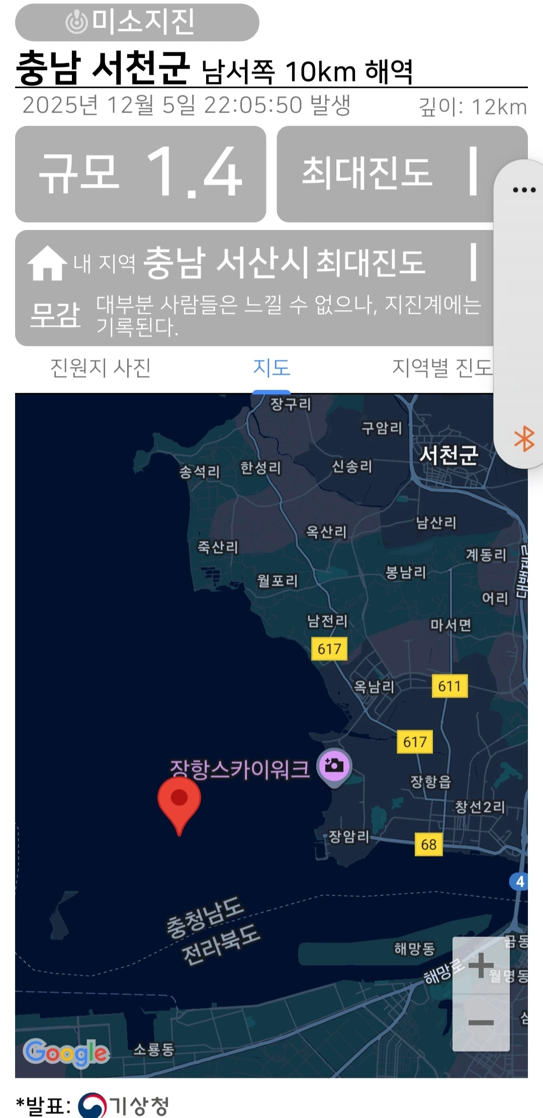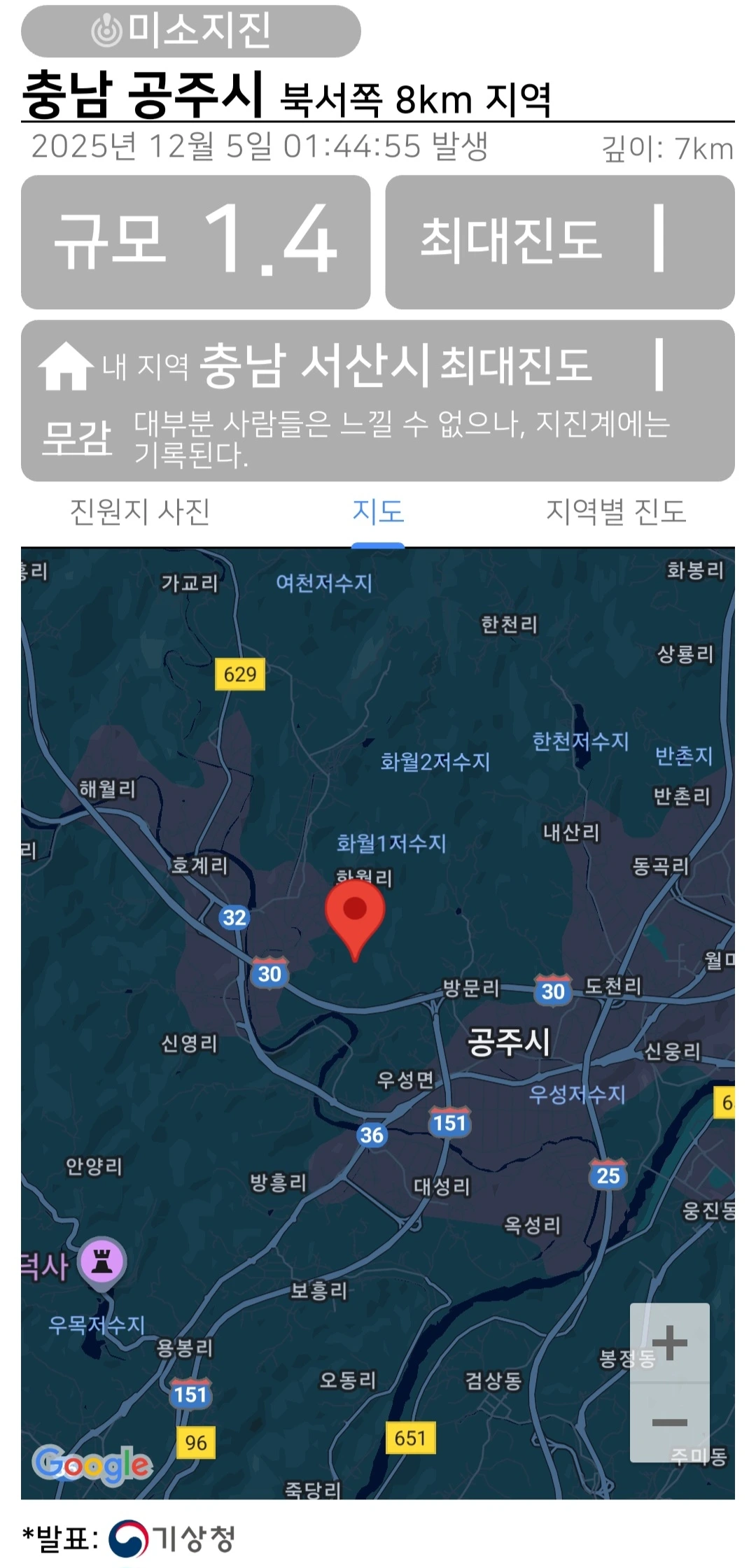충남 서천과 공주: 충청남도 지역은 비교적 안정적인 내륙으로 여겨지지만, 역사적으로나 최근에도 중규모 지진이 간헐적으로 발생해 왔습니다.