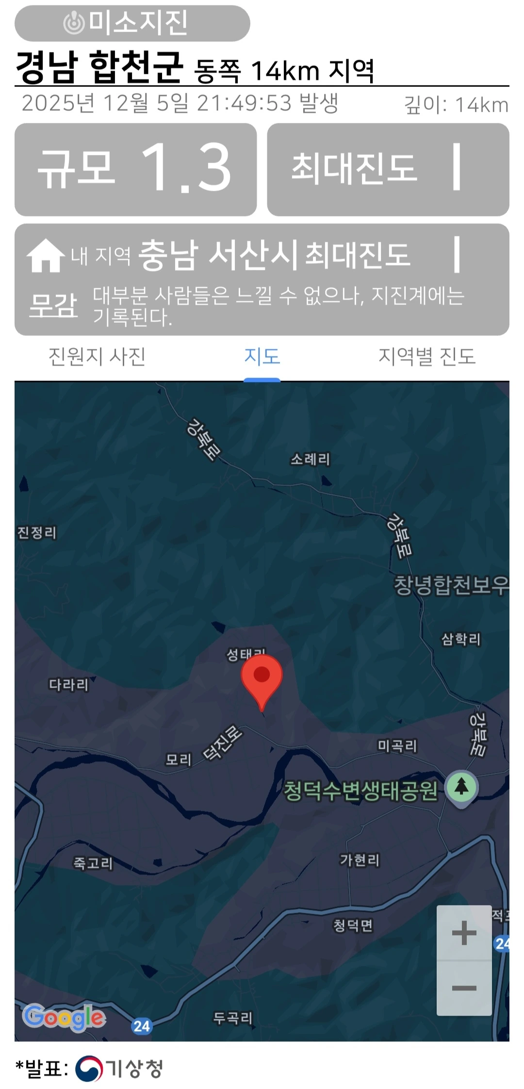 규모 1.3~1.4 사이의 이 떨림들은 충남 서천군, 경남 합천군, 강원 평창군, 그리고 충남 공주시의 땅속 깊은 곳에서 조용히 일어났다가 사라졌습니다.