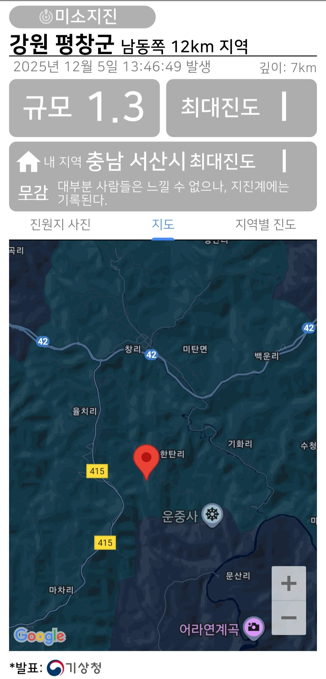 평창 남동쪽 지역의 1.3 규모 지진은 높은 산맥 아래, 깊은 땅속에서 일어난 고요한 에너지 방출입니다.