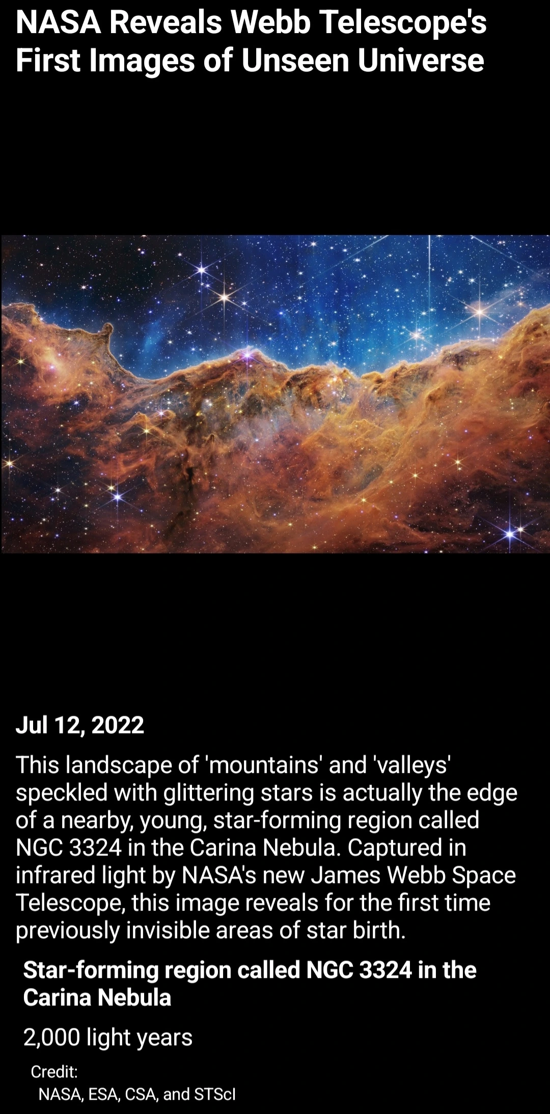 반짝이는 별들이 점처럼 박힌 "산"과 "계곡"의 이 풍경은 사실 용골 성운에 있는 NGC 3324라는 근처의 어린 별 형성 영역의 가장자리입니다. NASA의 새로운 제임스 웹 우주 망원경이 적외선으로 촬영한 이 사진은 이전에는 볼 수 없었던 별 탄생 영역을 처음으로 보여줍니다.