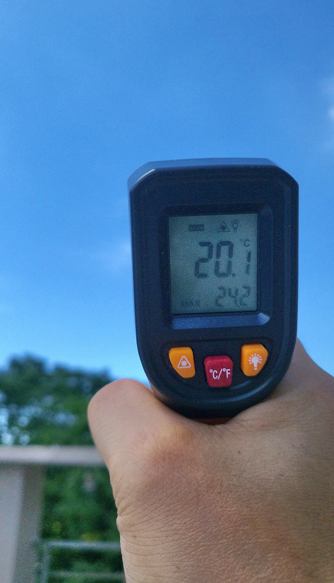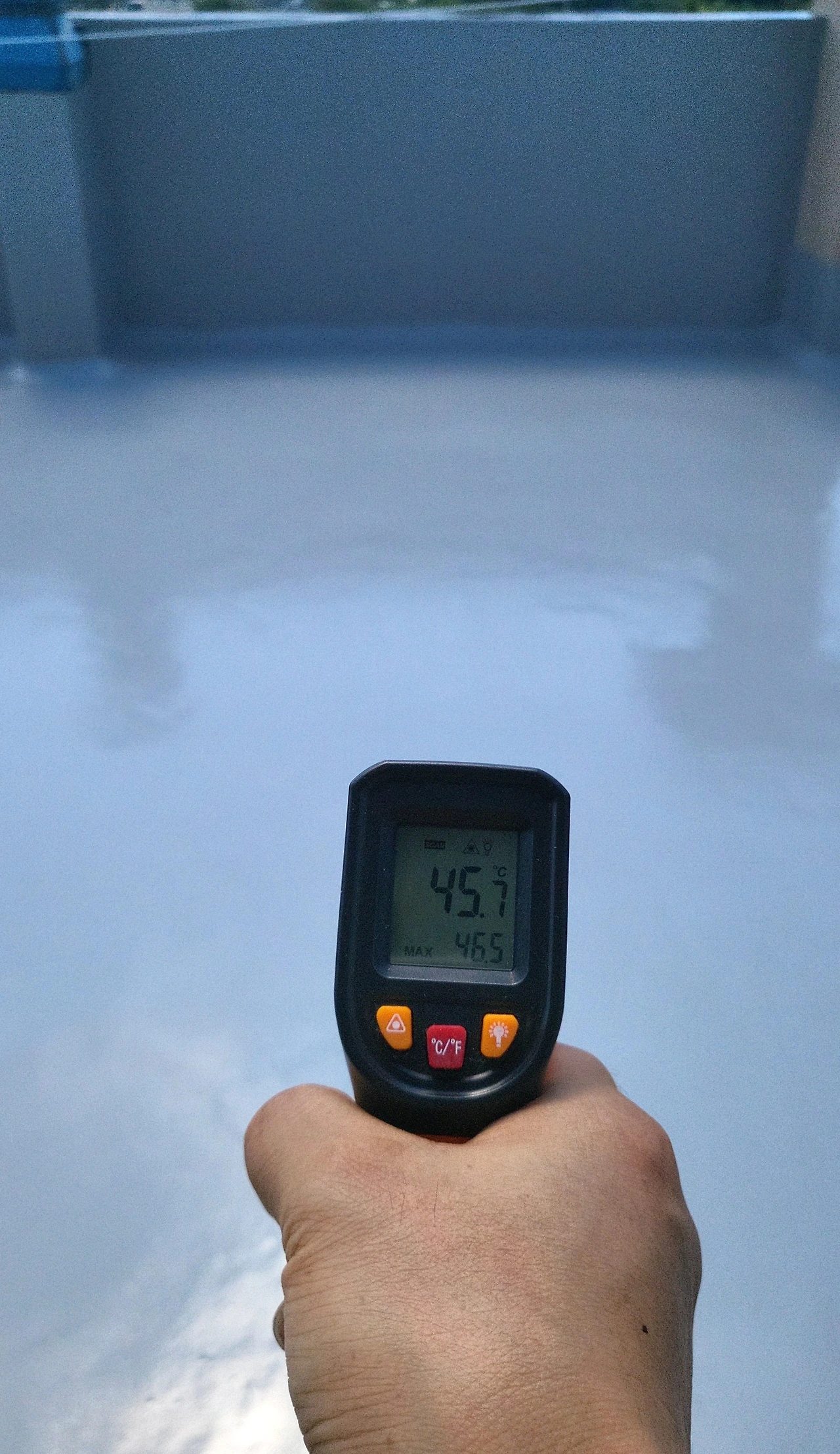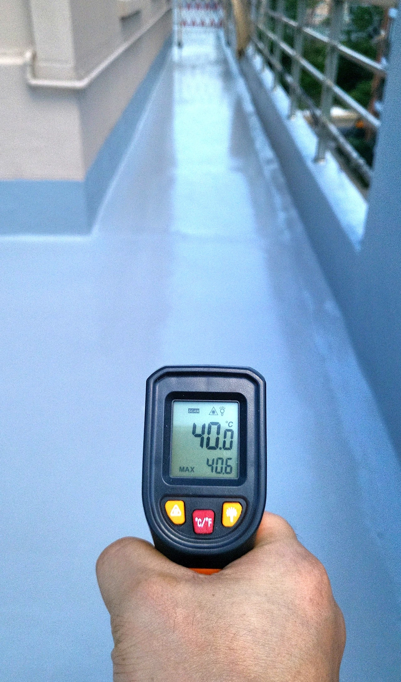 회색빛으로 칠해진 옥상 바닥은 마치 뜨겁게 달궈진 프라이팬 같습니다. 발을 내딛기조차 조심스러워집니다. 궁금증을 참지 못하고 손에 들린 적외선 온도계를 바닥에 향합니다.
