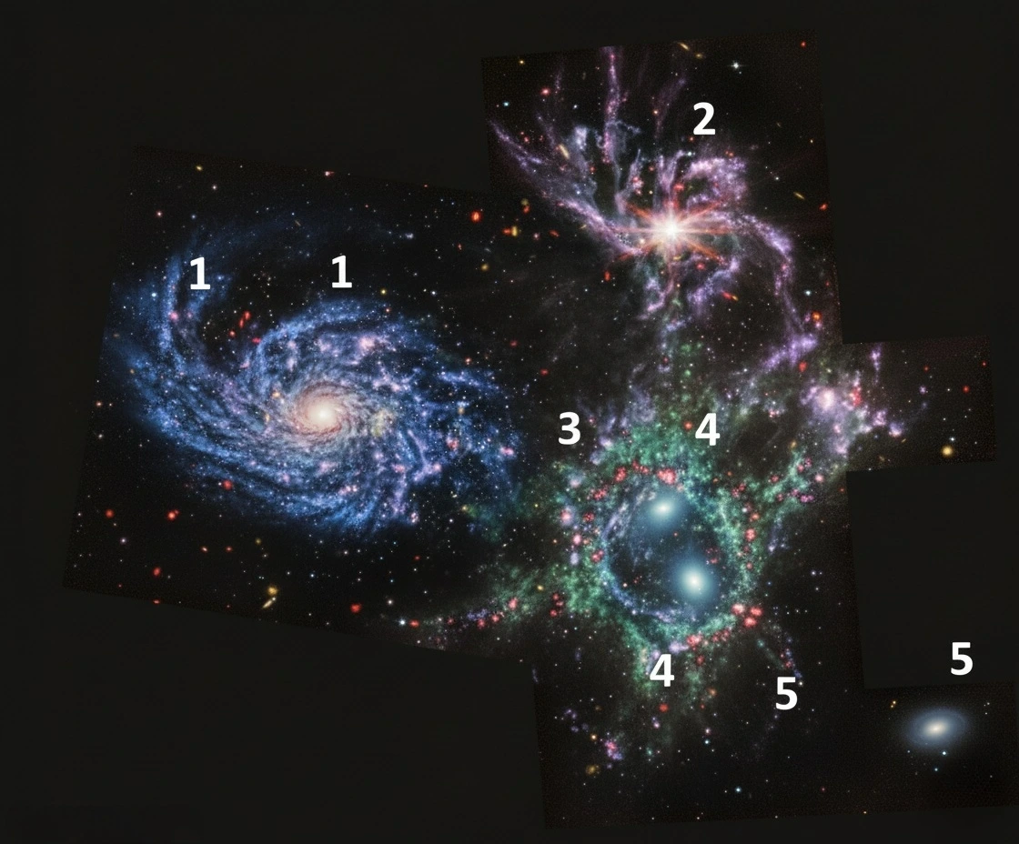 스테판의 오중주(Stephan's Quintet)는 단순한 별들의 모임이 아니라, 수억 년에 걸쳐 서로를 끌어당기고 밀어내는 거대한 우주의 드라마입니다.