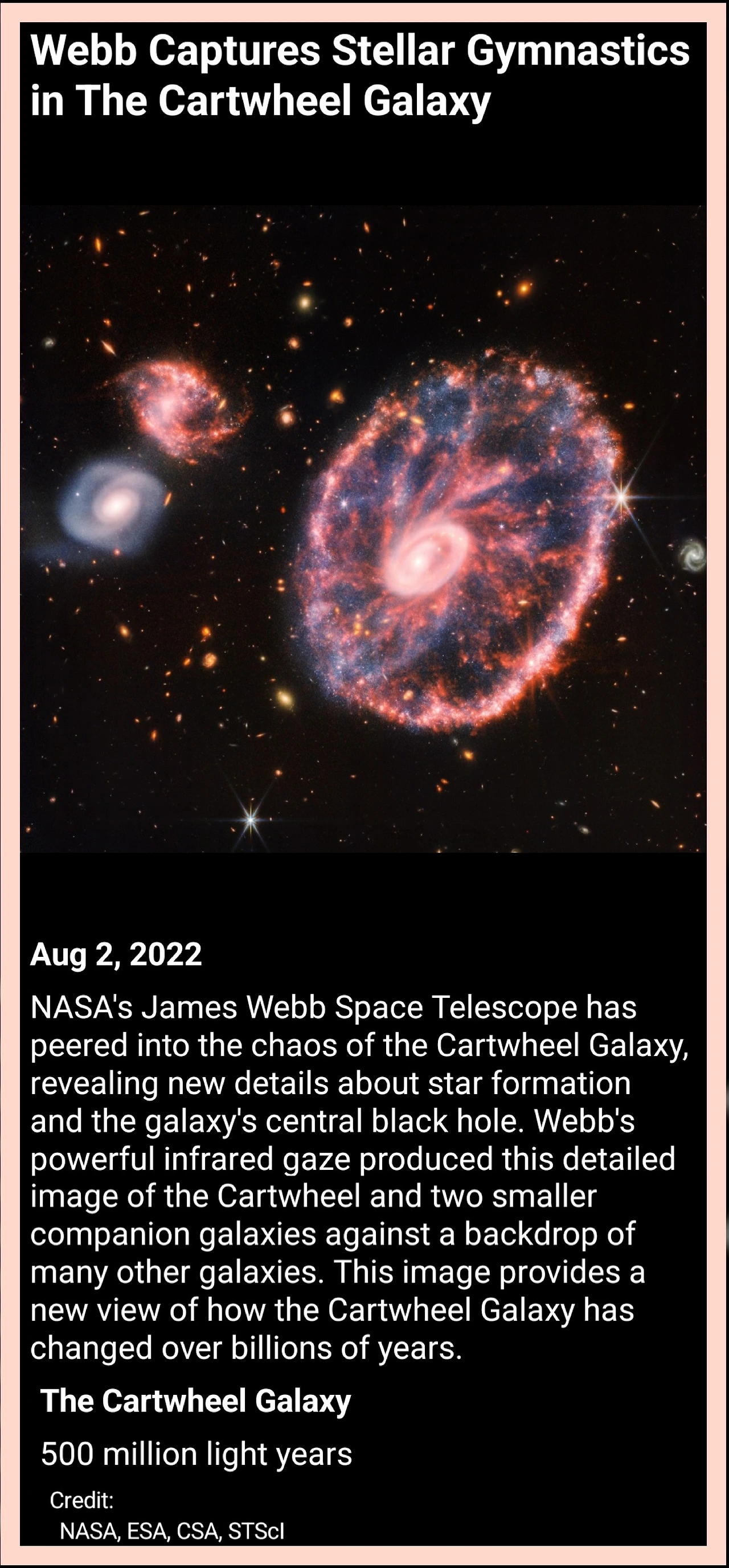 사실 이 수레바퀴 모양은 아주 오래전, 거대한 두 은하가 정면으로 충돌하며 만들어진 결과물입니다.