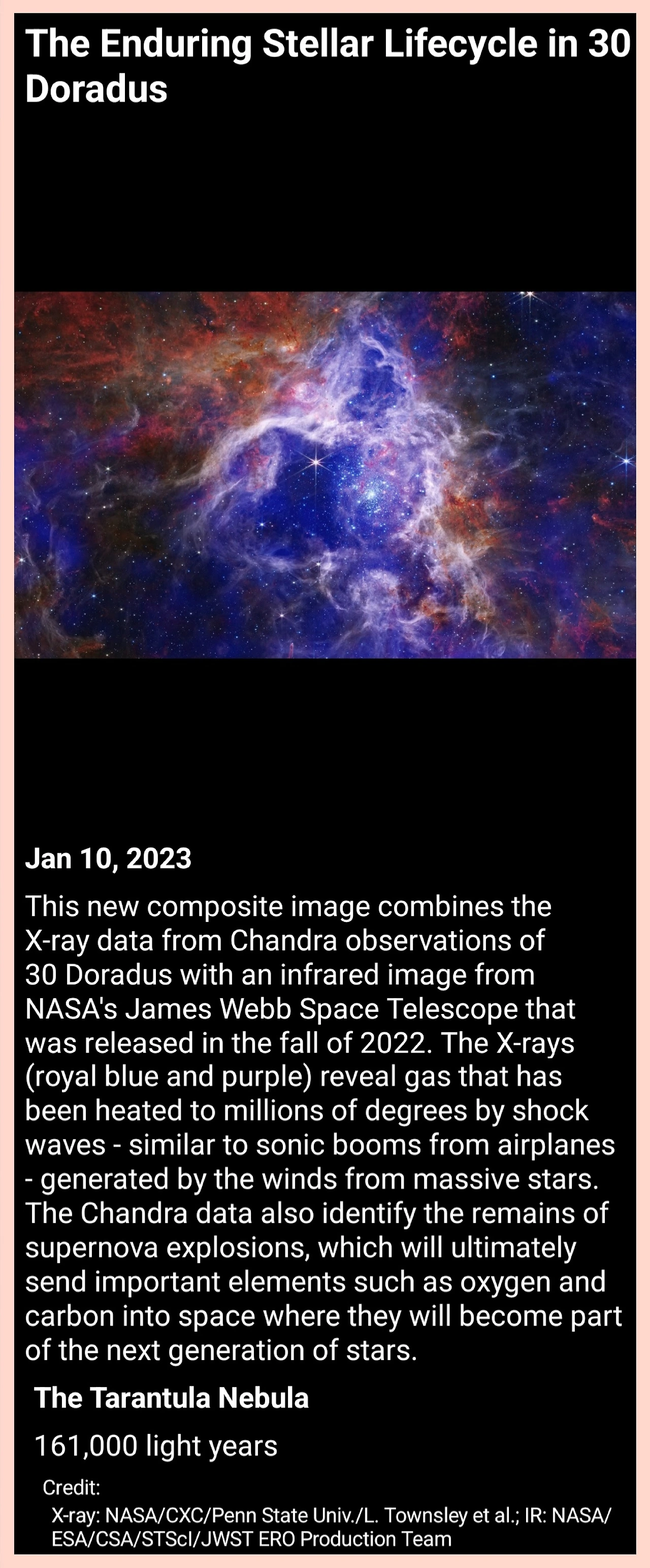 제임스 웹 우주망원경과 찬드라 엑스선 관측선이 합작해 낸 '30 도라도스(타란툴라 성운)'의 경이로운 모습은 단순히 아름다운 천체 사진을 넘어, 우주가 우리에게 건네는 장엄한 서사시와 같습니다.