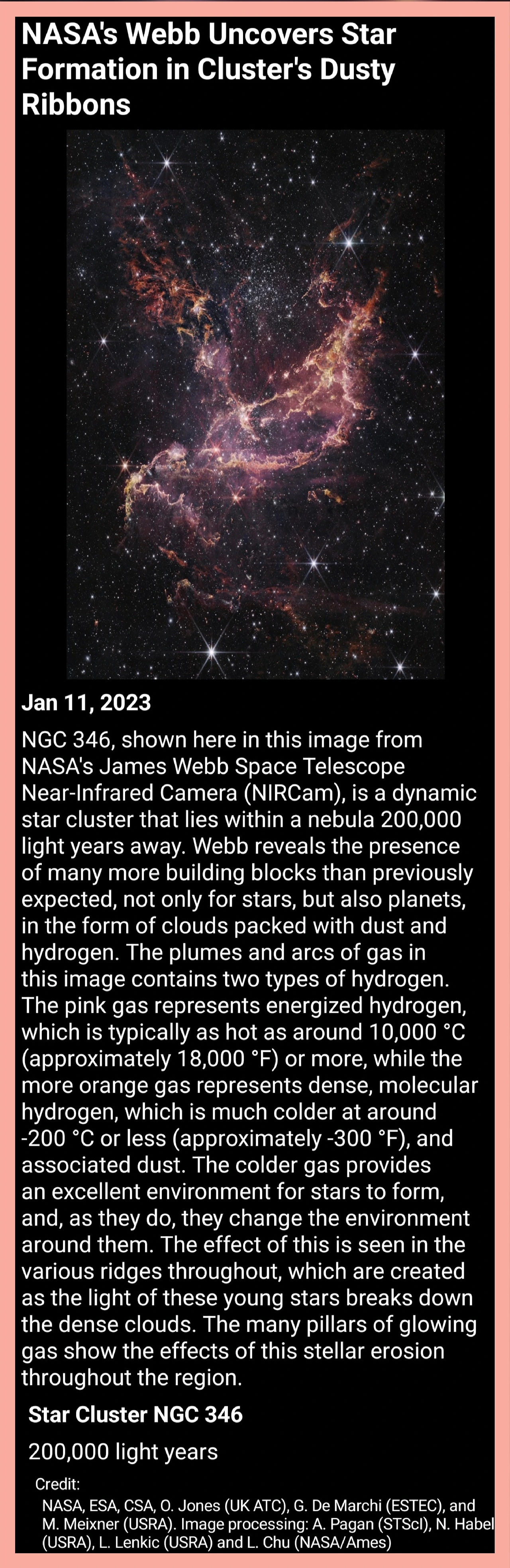 핑크색은 10,000°C가 넘는 뜨겁고 활기찬 수소이며, 오렌지색은 영하 200°C의 차갑고 빽빽한 가스와 먼지입니다.