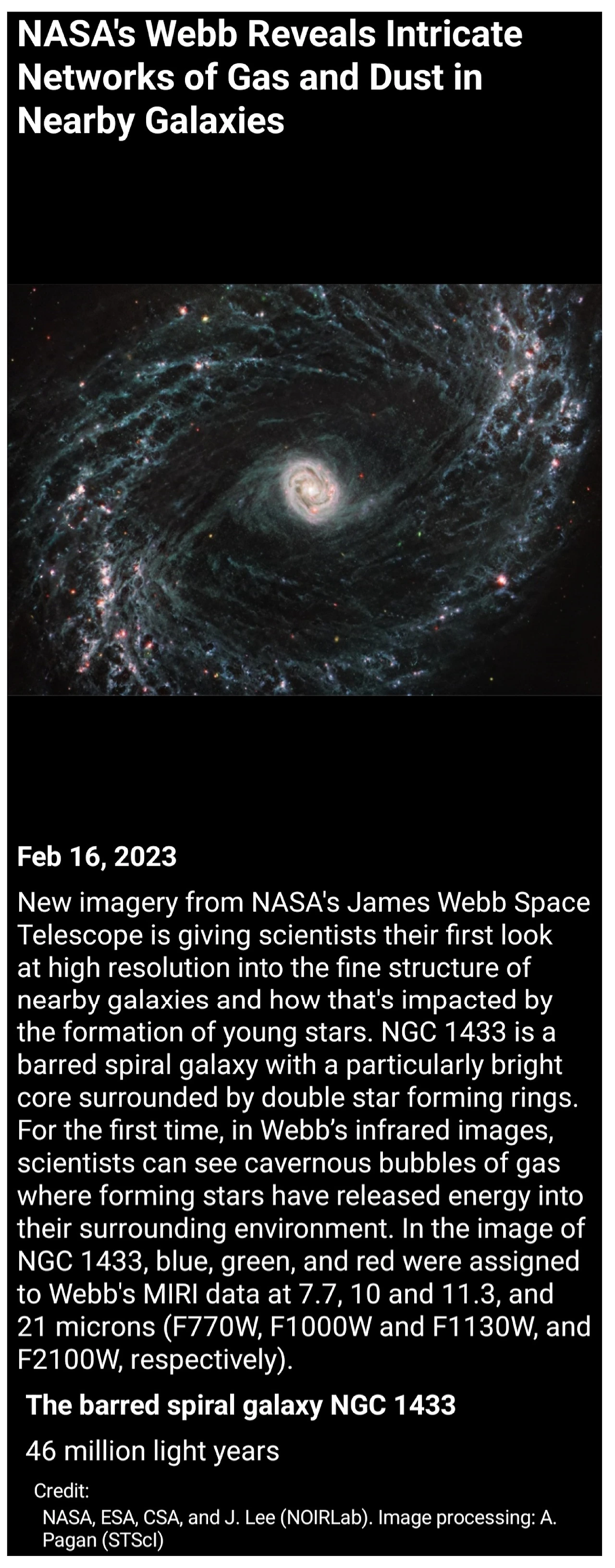 하지만 최근 제임스웹 우주망원경이 보내온 NGC 1433 은하의 사진은 우리에게 잊고 있던 설렘을 다시 일깨워줍니다.