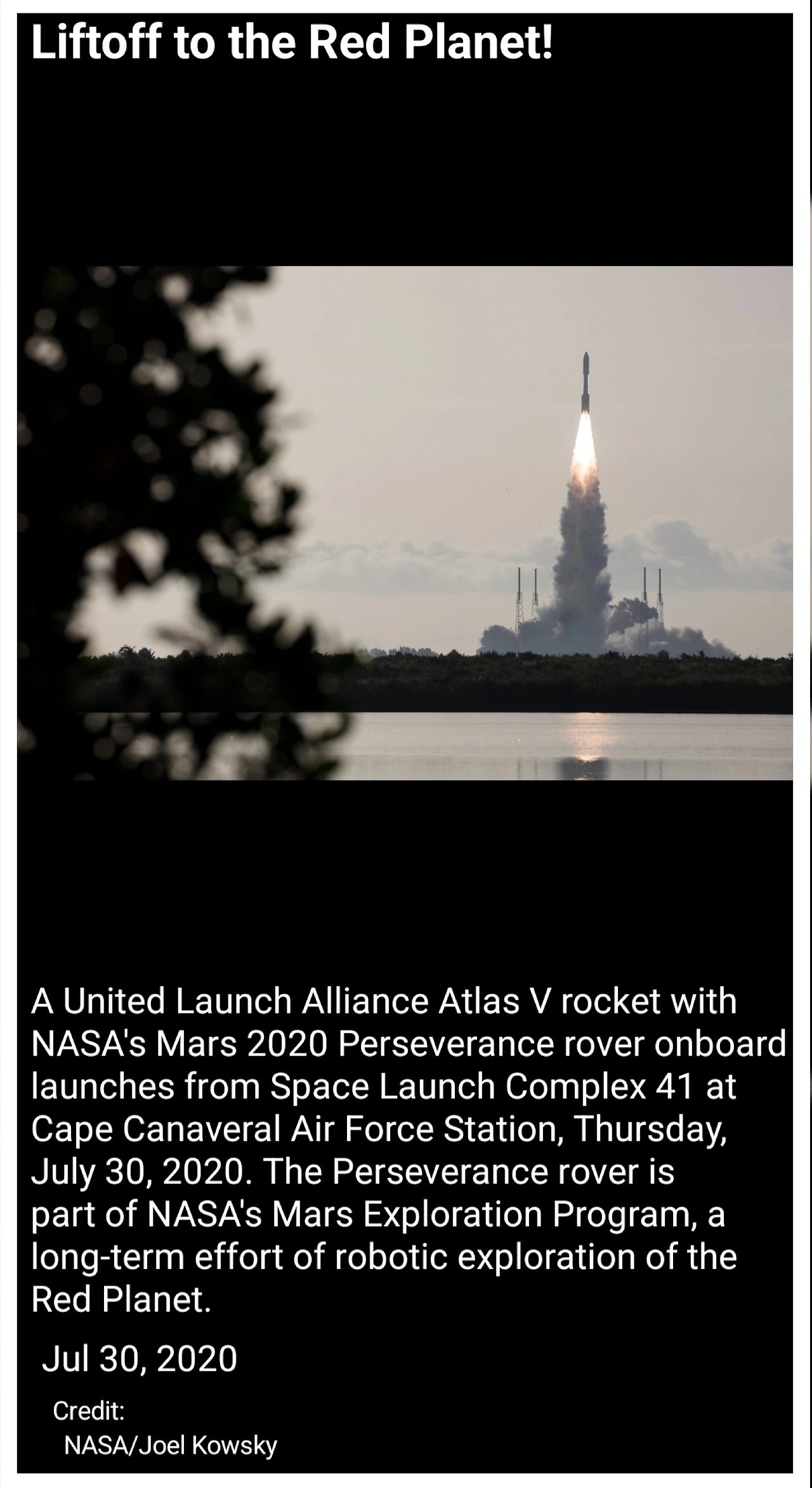 NASA의 화성 탐사 로버 퍼서비어런스를 탑재 한 유나이티드 런치 얼라이언스(ULA)의 아틀라스 V 로켓이 2020년 7월 30일 목요일, 케이프 커내버럴 공군기지 41번 발사대에서 발사되고 있다. 퍼서비어런스 로버는 화성 탐사 프로그램의 일환으로, 붉은 행성을 로봇으로 탐사하는 장기적인 프로젝트이다.