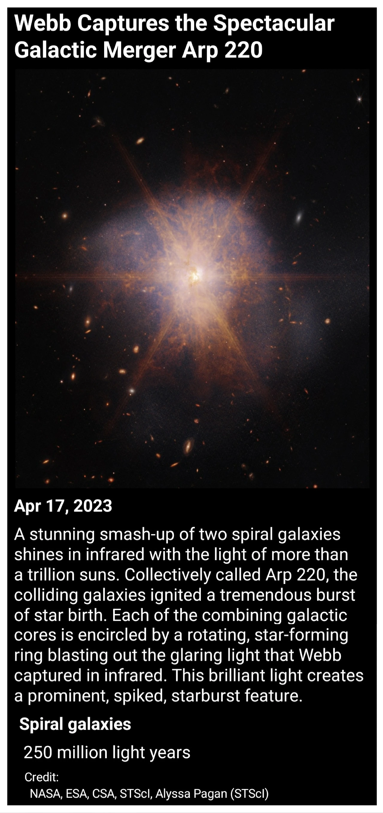 수많은 은하들 사이에서 찬란한 등대처럼 빛나는 아르프 220은 NASA의 제임스 웹 우주 망원경이 촬영한 이 사진에서 밤하늘을 환하게 밝히고 있습니다. 실제로 두 개의 나선 은하가 합쳐지는 과정에 있는 아르프 220은 적외선 영역에서 가장 밝게 빛나기 때문에 관측하기에 이상적인 대상입니다.
