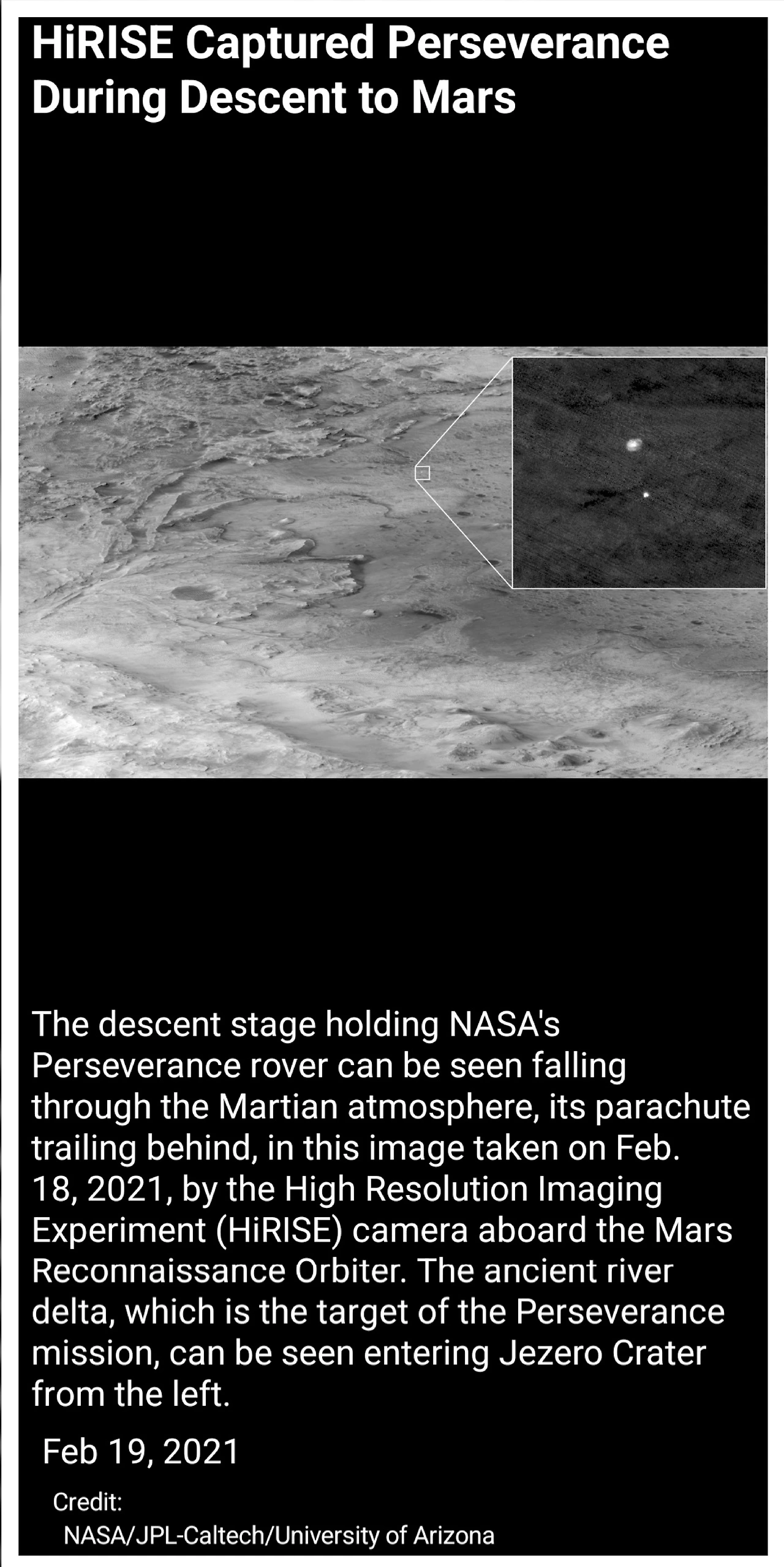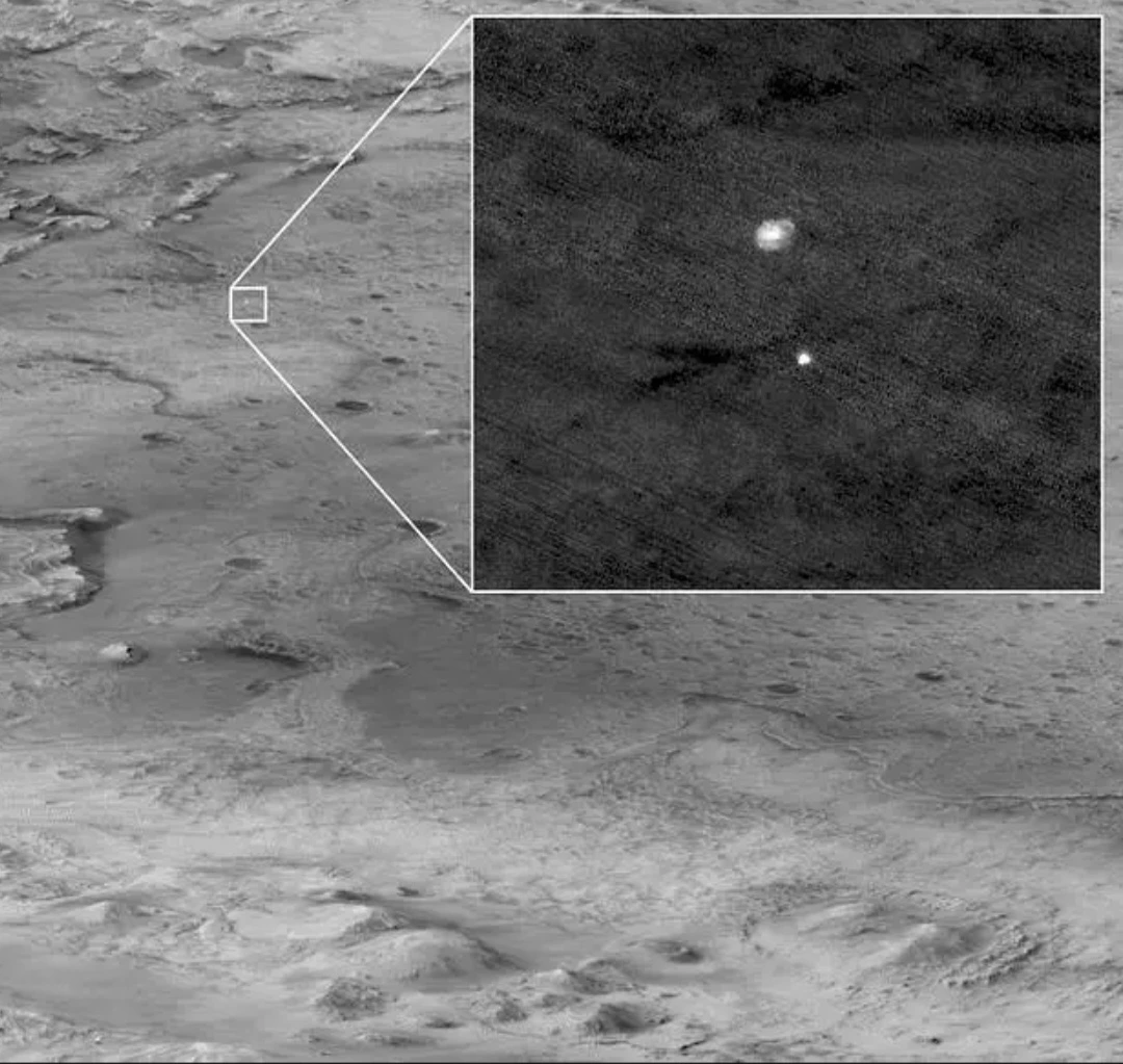 그 먼 거리에서, 낙하산을 펼치고 내려가는 작은 로버를 포착하기 위해 궤도선은 기수를 치켜들고 급격히 회전했습니다.