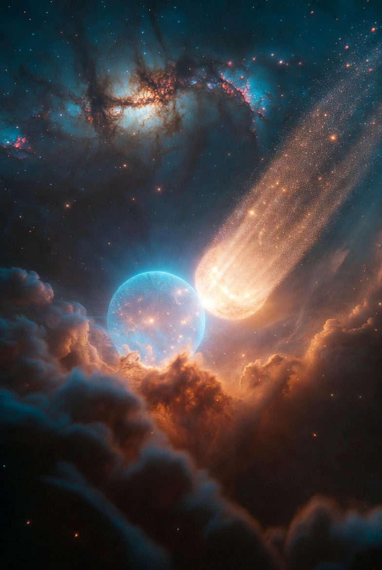 한 별이 스스로의 몸을 가볍게 떨며 푸르스름한 새벽빛을 흘리면, 곁에 있던 별은 기다렸다는 듯 황금빛 가루를 뿌리며 응답했습니다. 그 빛들이 서로의 몸에 닿아 부서질 때, 비로소 고요했던