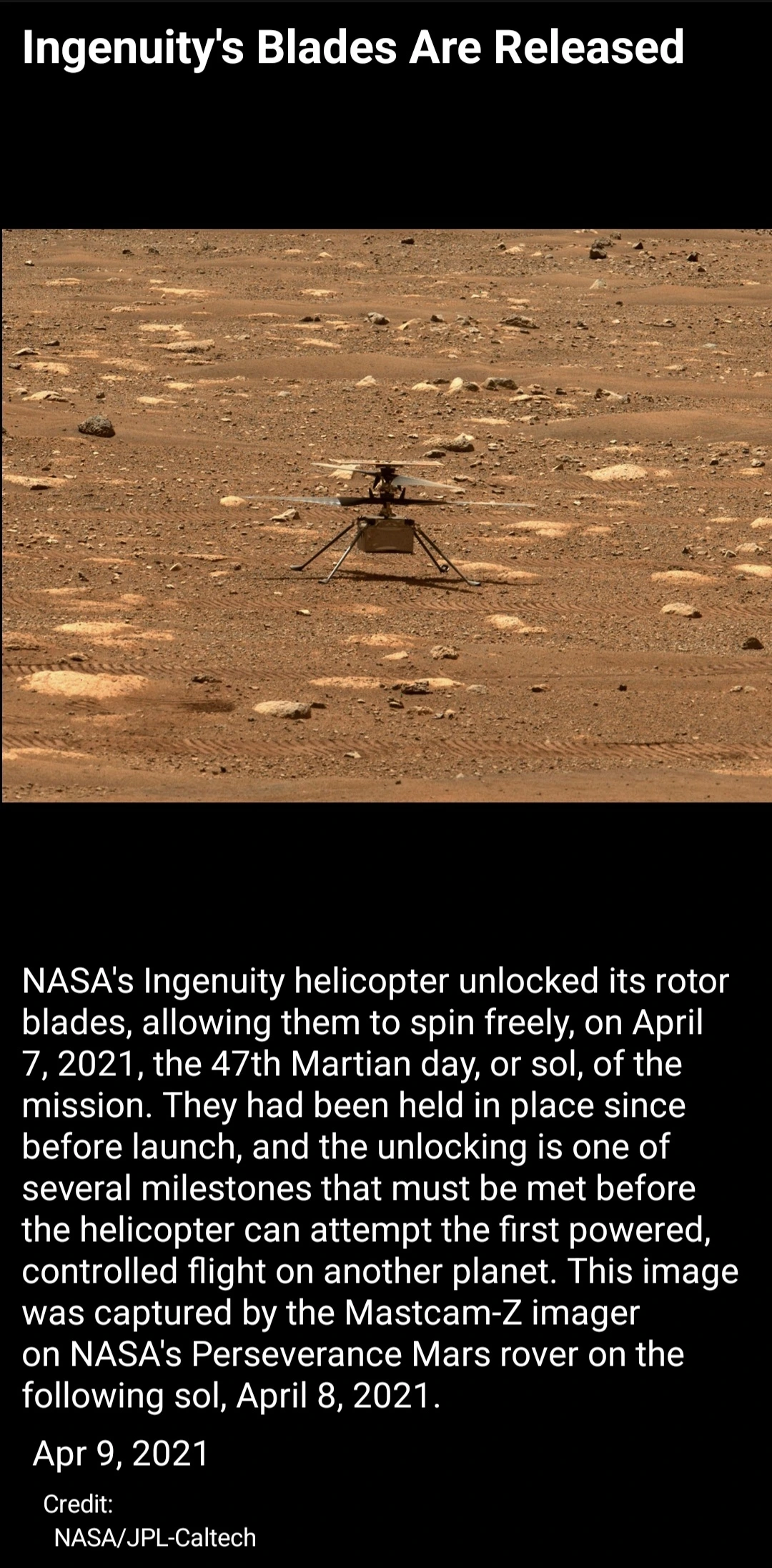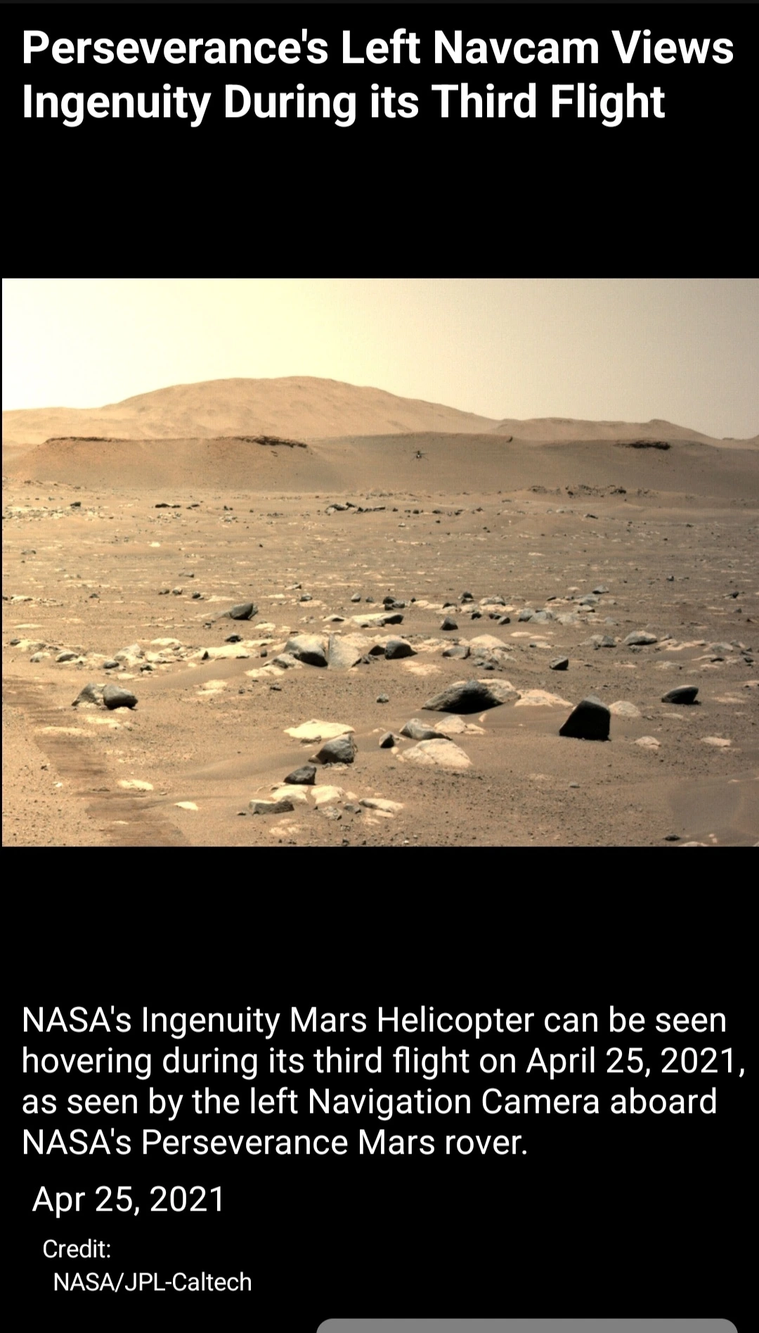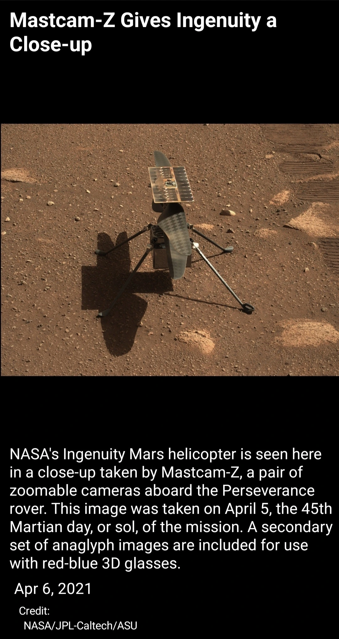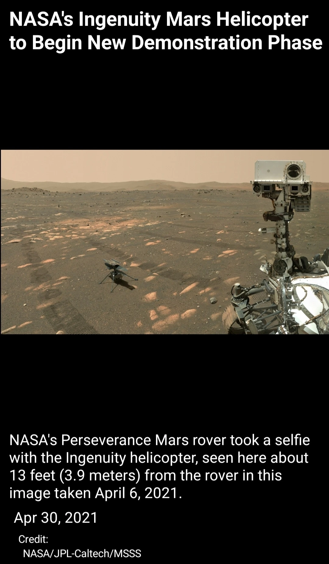NASA의 퍼서비어런스 화성 탐사선이 2021년 4월 6일, 화성 탐사 임무 46번째 날(솔)에 촬영된 이 사진에서 약 3.9미터(13피트) 떨어진 곳에 있는 인제뉴이티 헬리콥터와 함께 셀카를 찍었습니다. 이 사진은 탐사선의 긴 로봇 팔 끝에 위치한 SHERLOC(Scanning Habitable Environments with Raman and Luminescence for Organics and Chemicals) 장비의 WATSON(Wide Angle Topographic Sensor for Operations and eNgineering) 카메라로 촬영되었습니다.