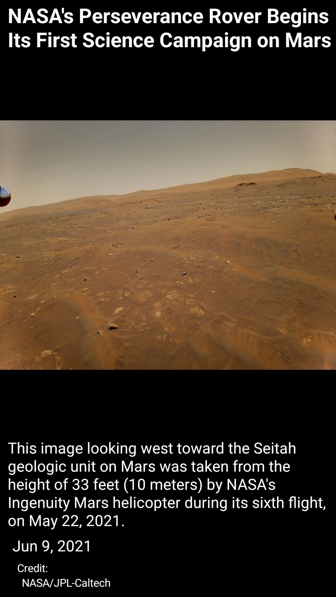 이 사진은 NASA의 인제뉴이티 화성 탐사 헬리콥터가 2021년 5월 22일 6번째 비행 중 상공 10미터(33피트) 높이에서 촬영한 것으로, 화성의 세이타 지질층을 서쪽 방향으로 바라본 모습입니다.