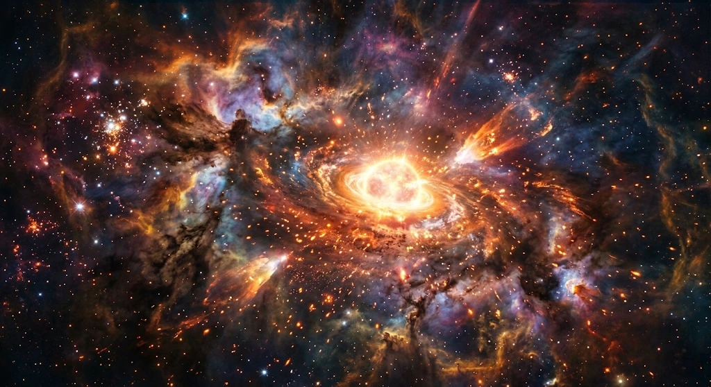 "별의 탄생은 거대한 성간 먼지들이 충돌하고 뭉쳐지는 혼돈 속에서 시작된다.
