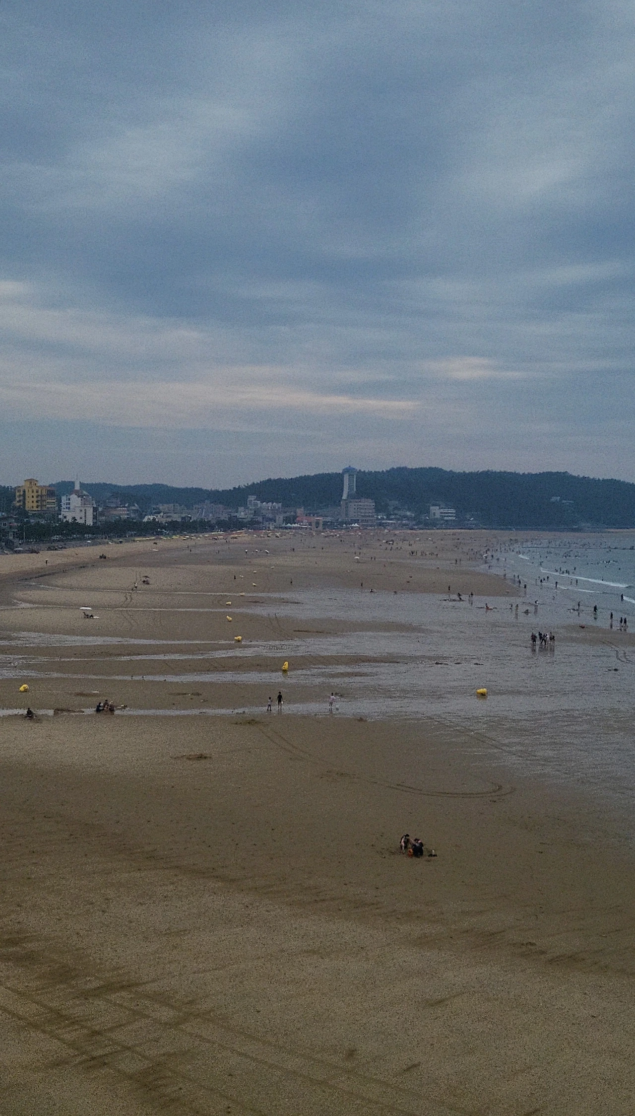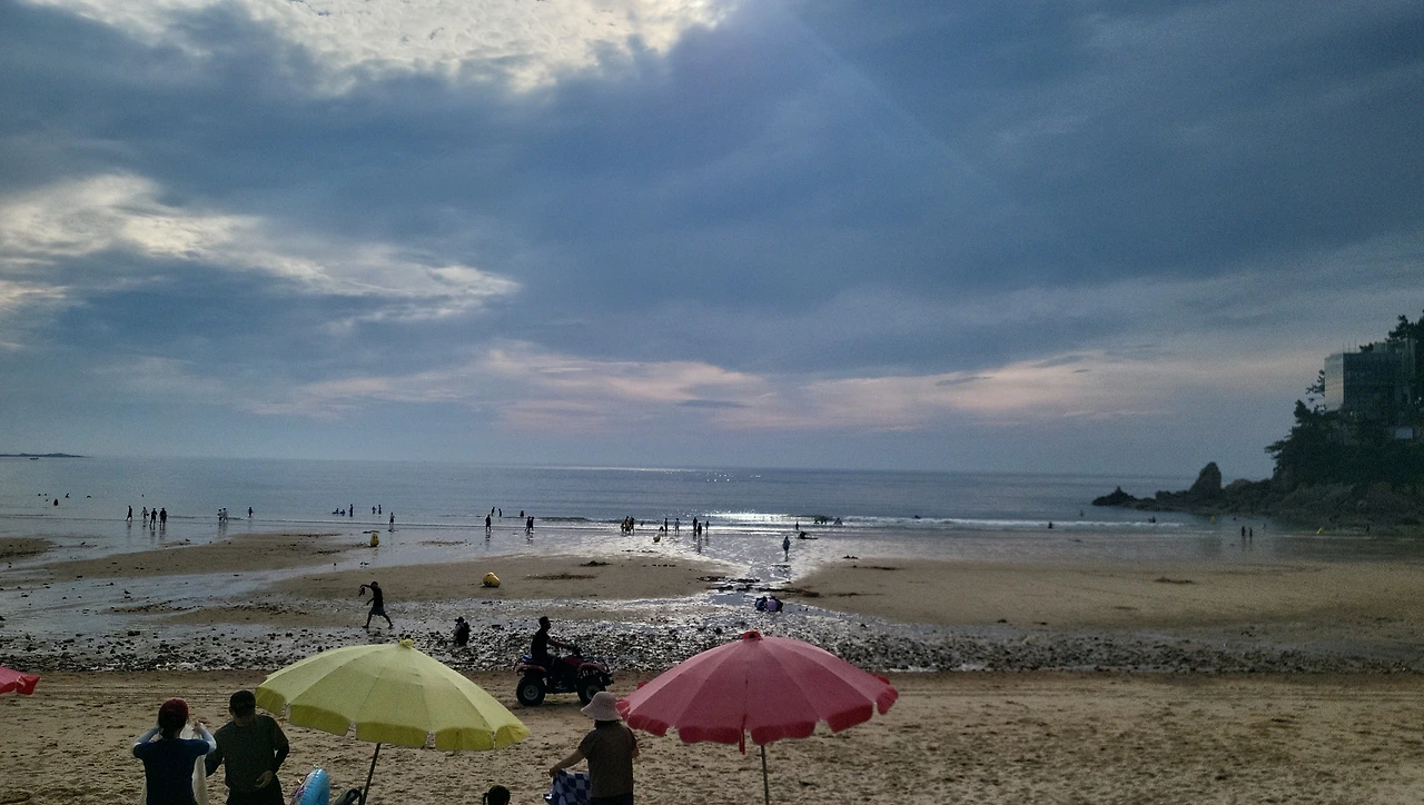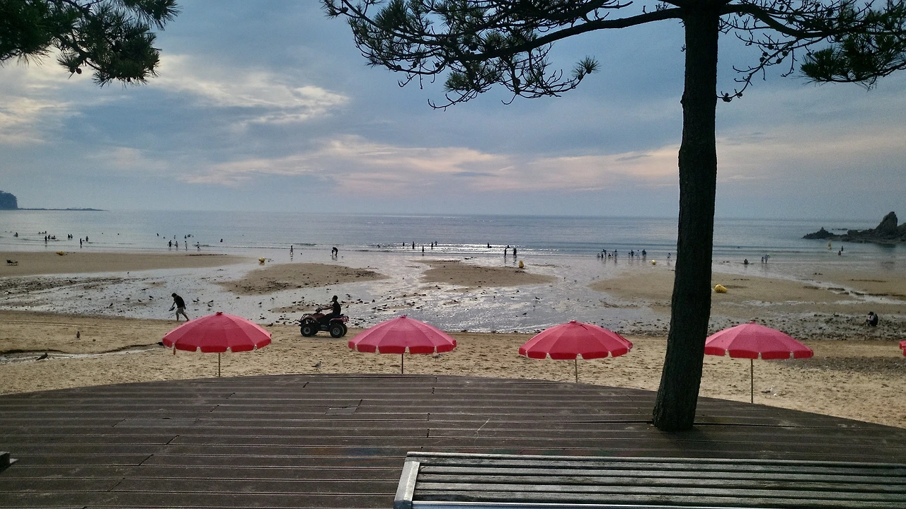썰물 때 드러났던 백사장은 어느새 바닷물로 잠기고, 해변의 풍경은 또 다른 모습으로 변했다. 붉은색 파라솔 아래에 앉아 바다를 바라보는 사람들은 평화로워 보였다.