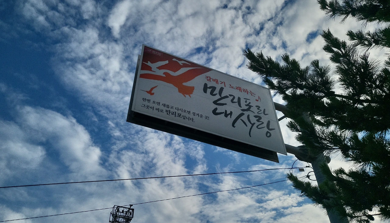 만리포 해변을 상징하는 듯한 표지판에는 '갈매기 노래하는 만리포, 나의 사랑'이라는 문구가 적혀 있었다.