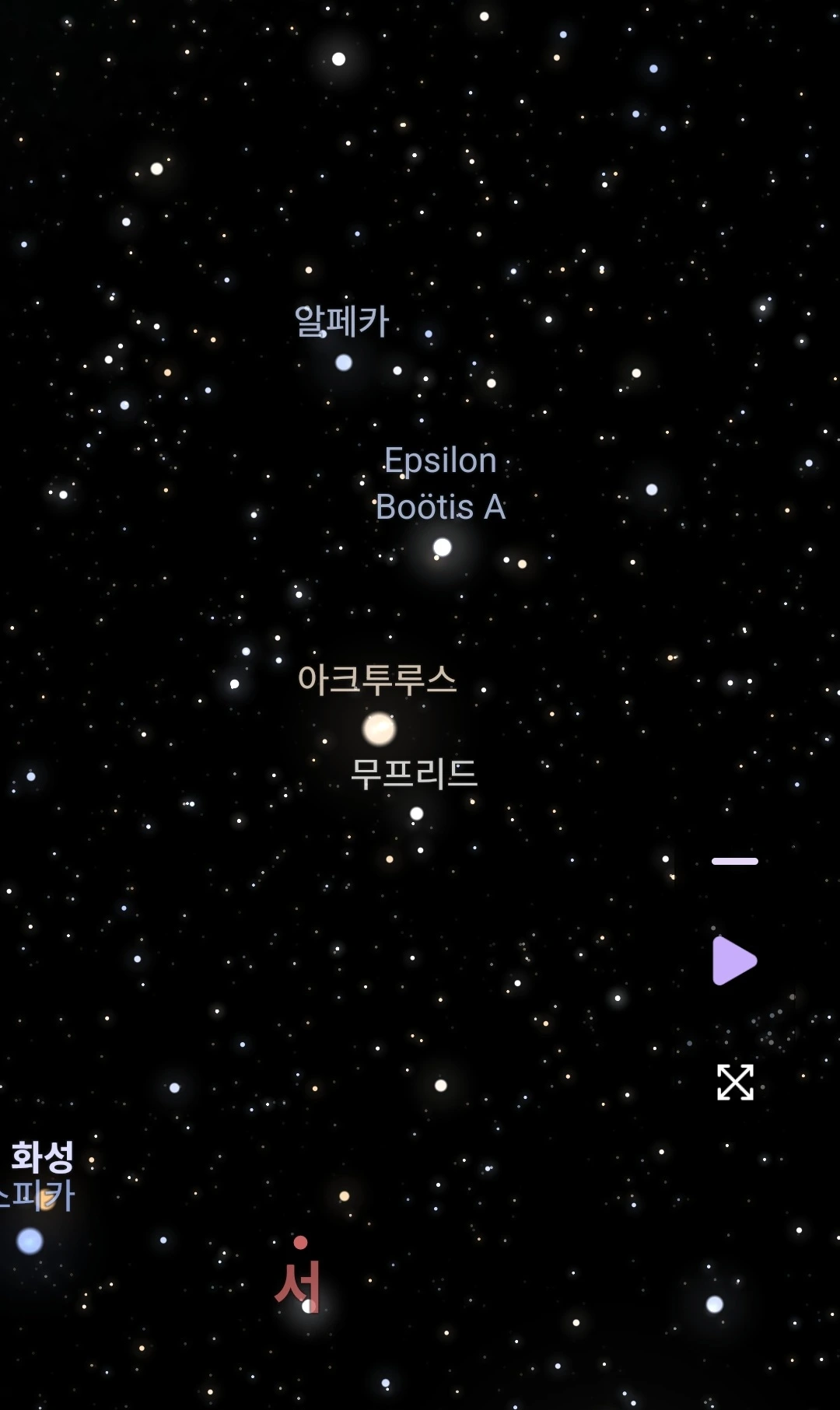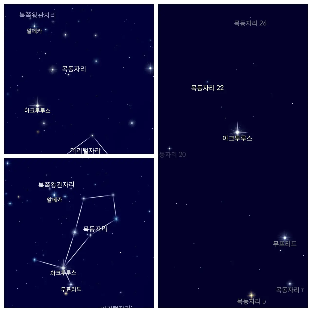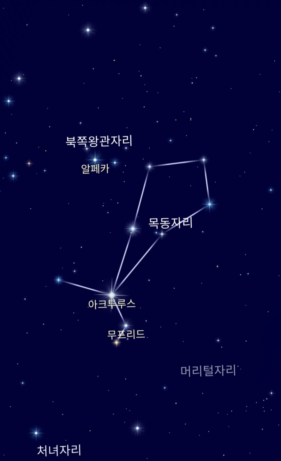 앱의 화면 속에서 아르크투루스는 목동자리라는 울타리 안에 소중히 자리 잡고 있었습니다. 목동자리, 그 이름에서 느껴지는 풋풋하고 따뜻한 감성. 밤낮으로 양 떼를 보살피는 목동처럼, 이 별은 오랜 세월 동안 하늘을 지키며 수많은 이들의 삶을 묵묵히 비춰왔습니다.