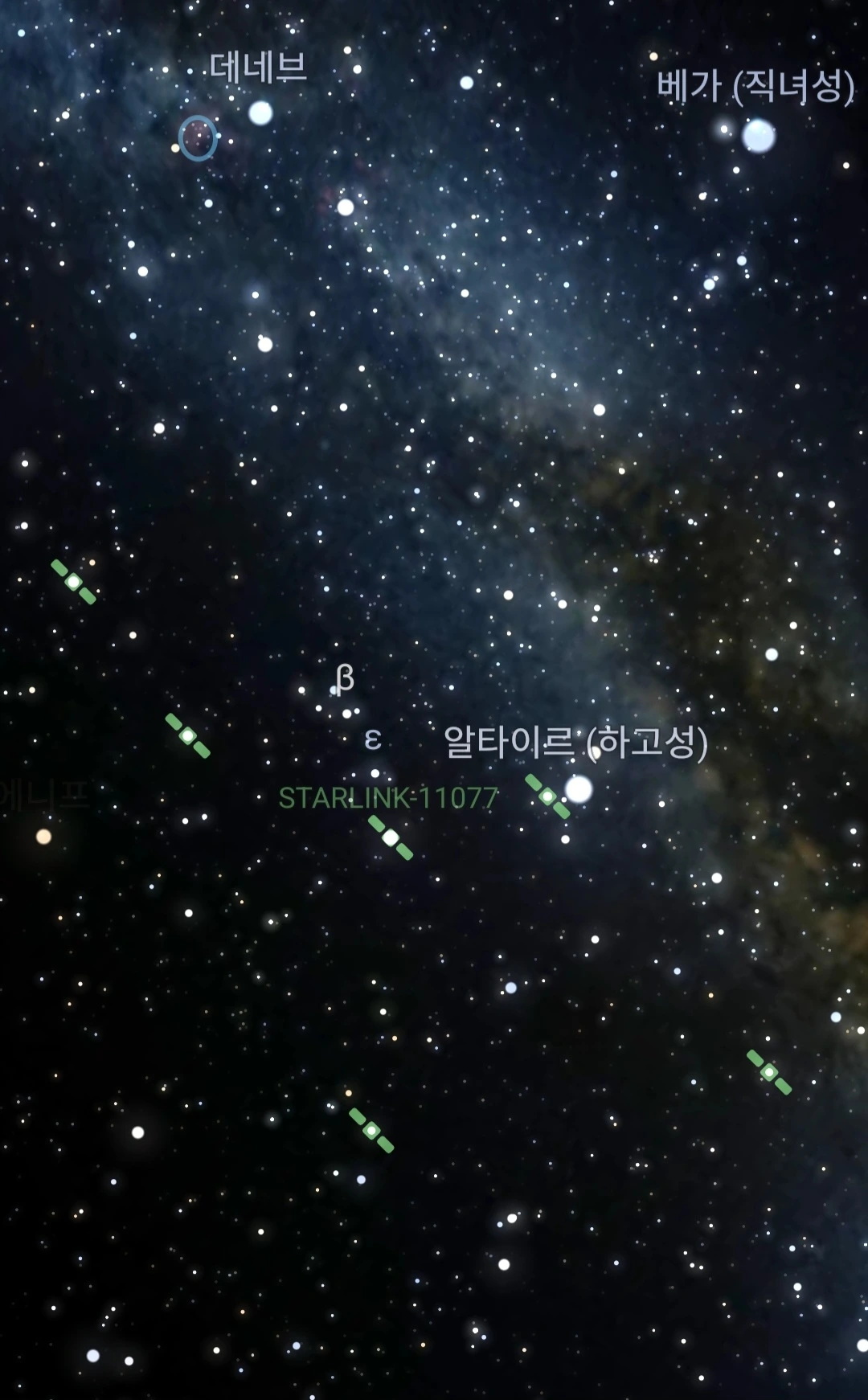 그리고 그 별들 사이를 가로지르는 녹색의 빛. 'STARLINK-11077'라는 이름표를 단 인공위성 무리가 질서 정연하게 우주를 가로지른다. 경이로운 자연의 신비와 첨단 문명의 발자취가 한 프레임 안에 공존하는 순간, 우리는 깊은 질문과 마주하게 된다.