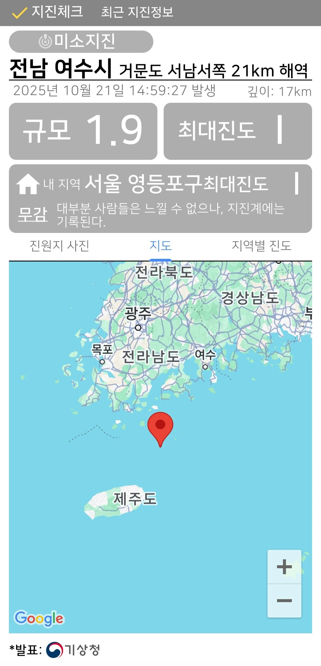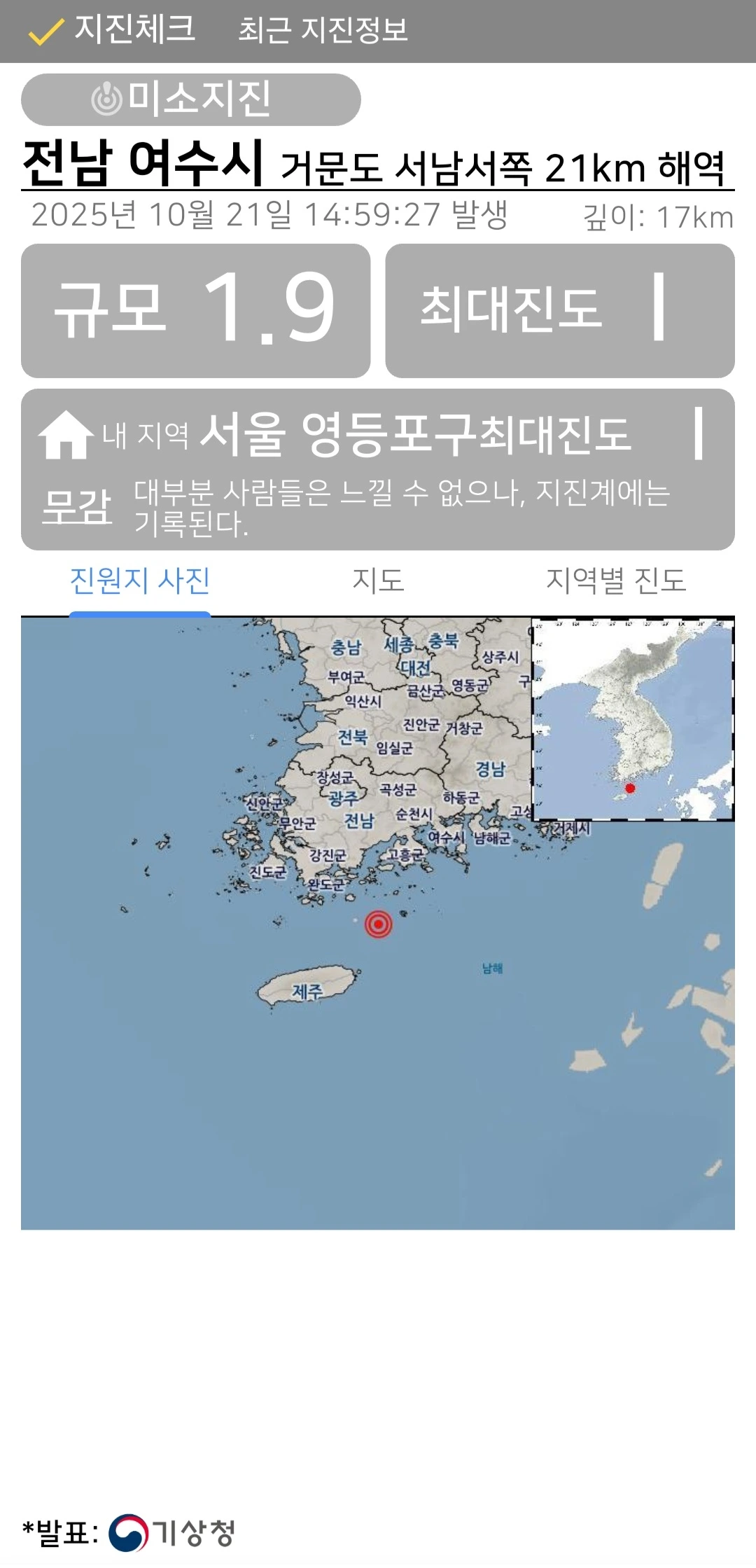 전남 여수시 거문도 서남서쪽 21km 해역에서 규모 1.9의 아주 작은 지진이 발생했습니다.