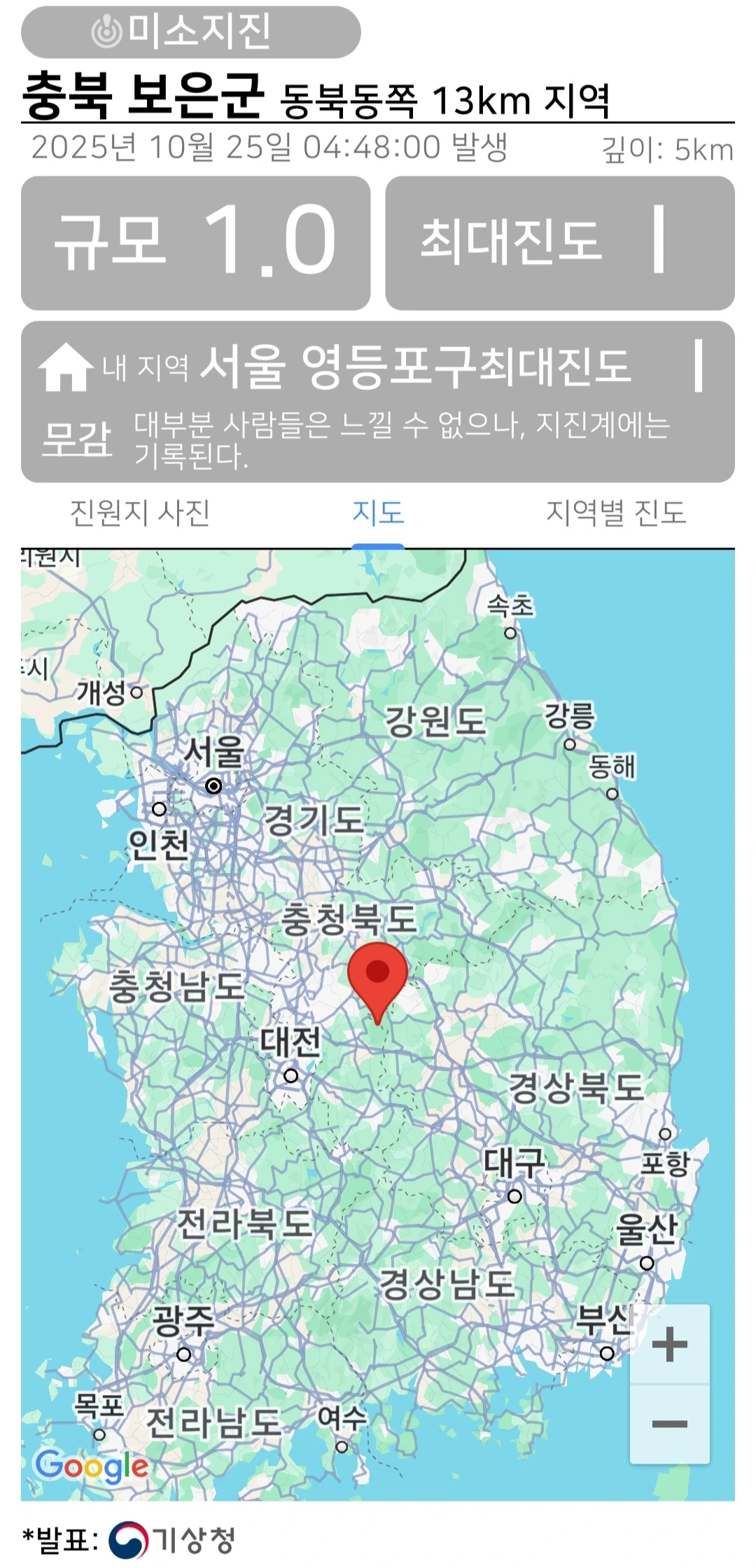 2025년 10월 25일의 새벽, 충북 보은군 동북동 쪽 13km 지역에서 규모 1.0의 미소지진이 일어났습니다.