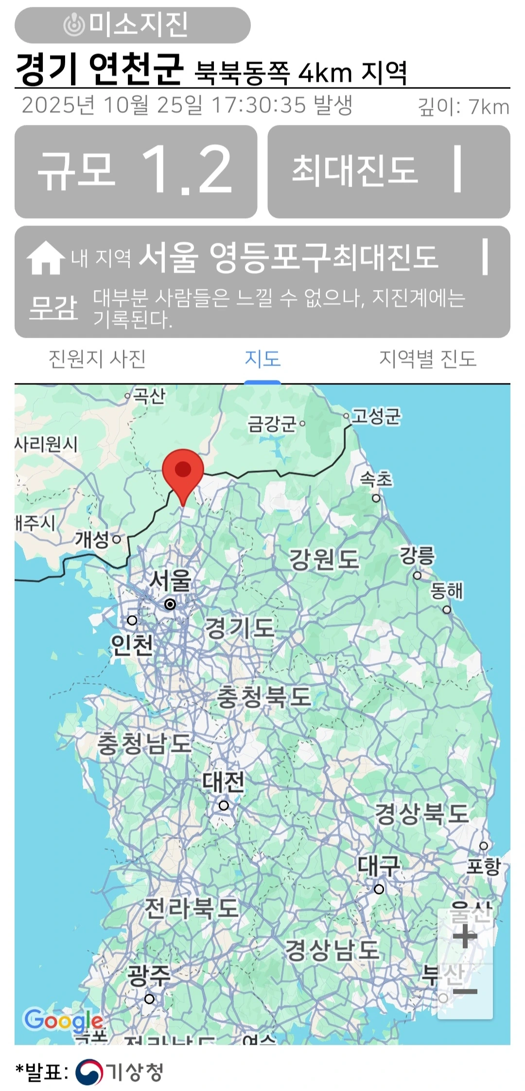 같은 날 늦은 오후, 경기 연천군 북동쪽 4km 지역에서는 규모 1.2의 미소지진이 발생했습니다.