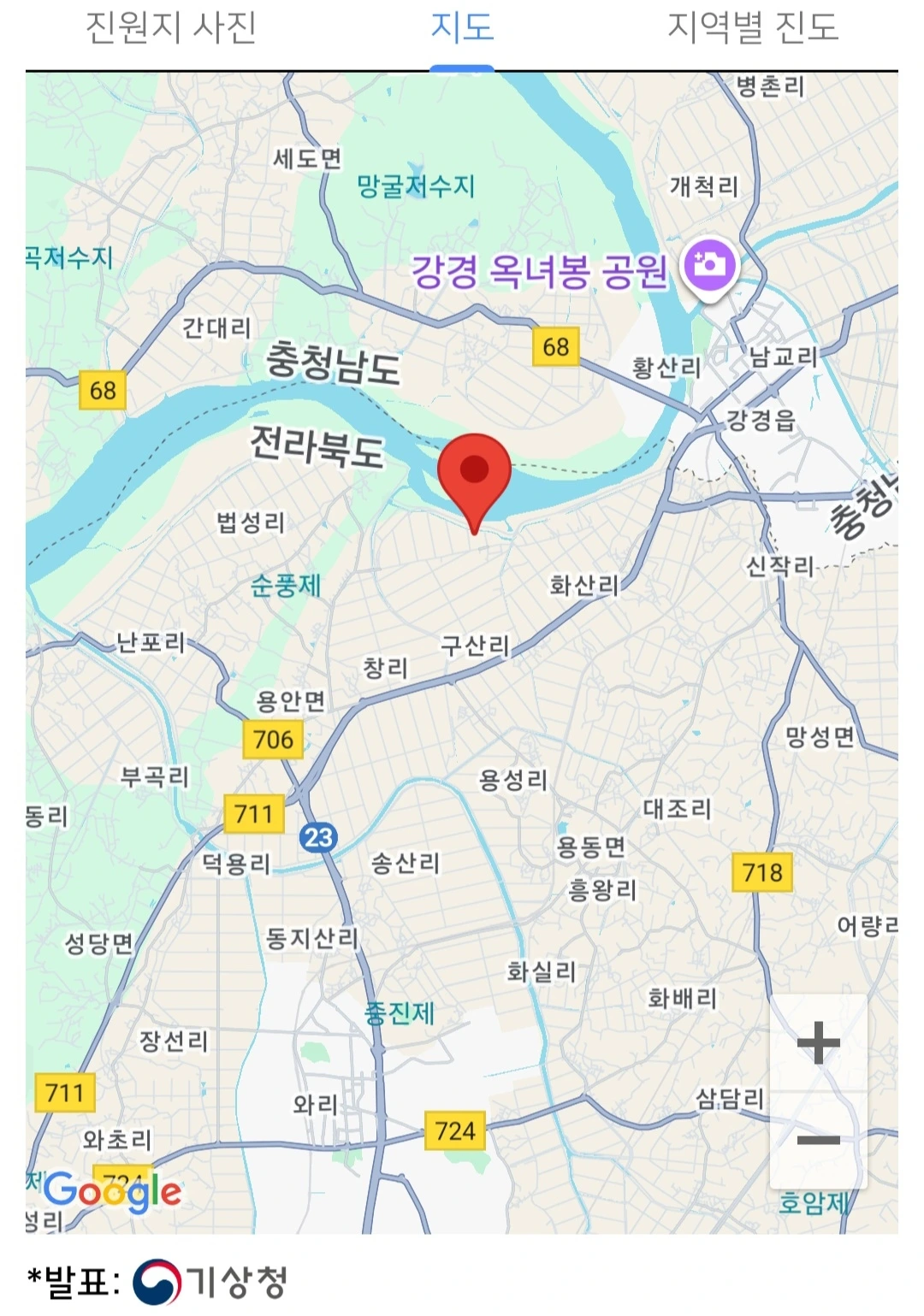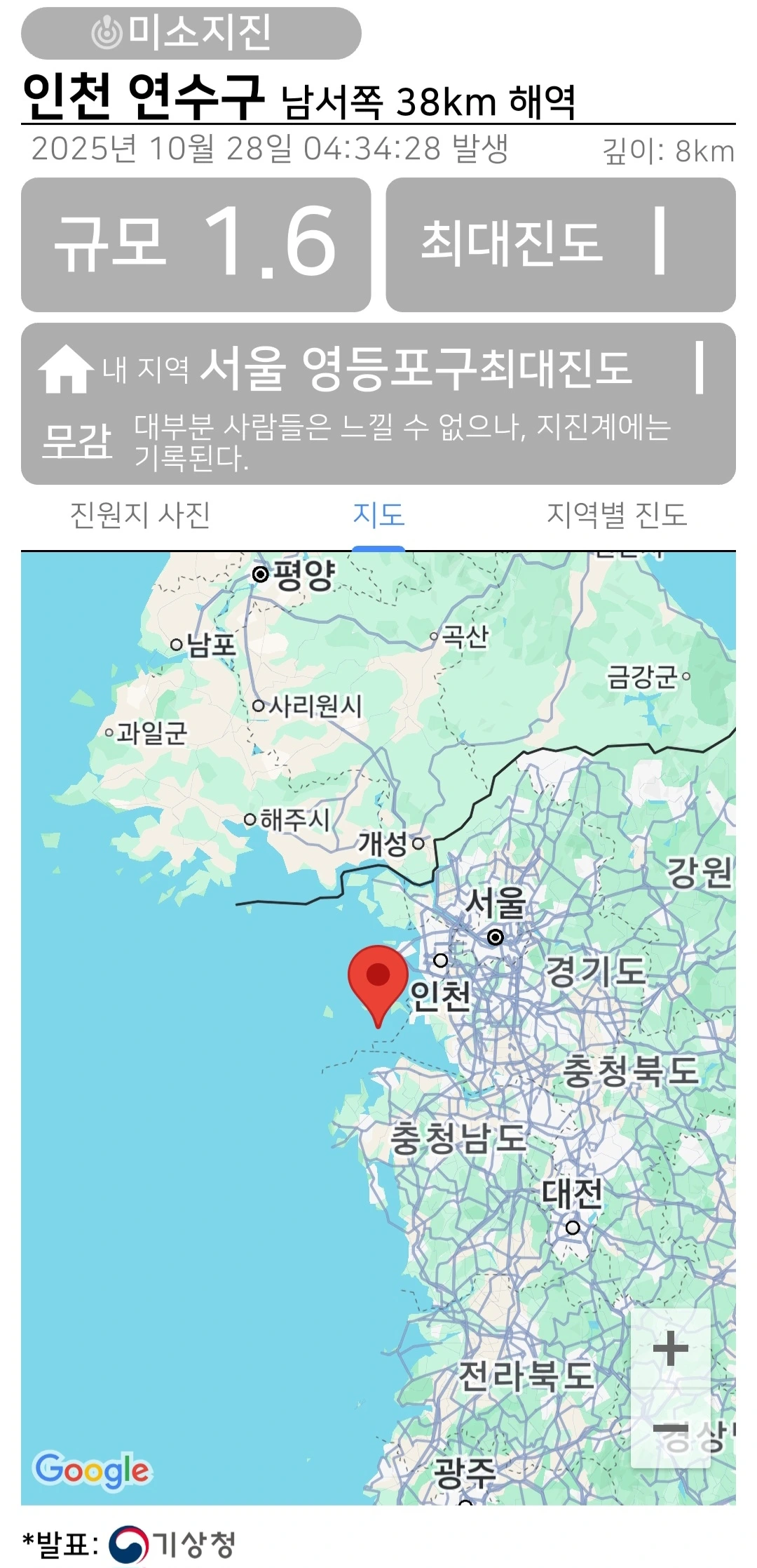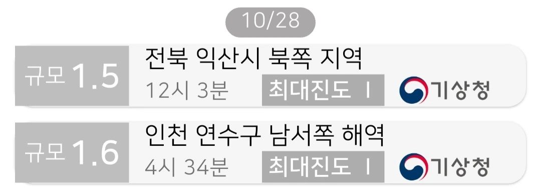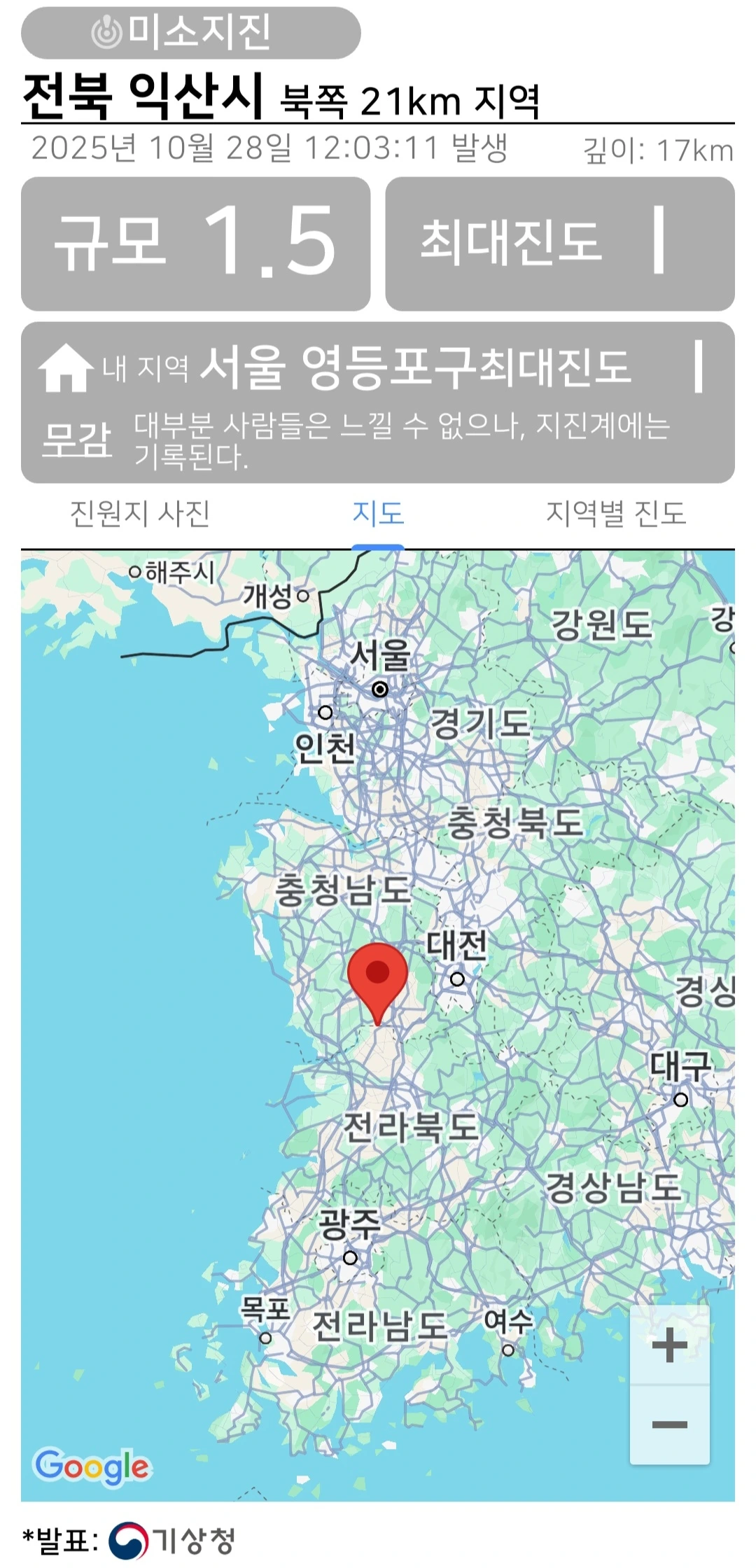 사진 속 2025년 10월 28일, 전북 익산시 북쪽과 인천 연수구 남서쪽 해역에서 발생한 규모 1.5와 1.6의 미소지진은 그저 수많은 일상적인 떨림 중 일부입니다.
