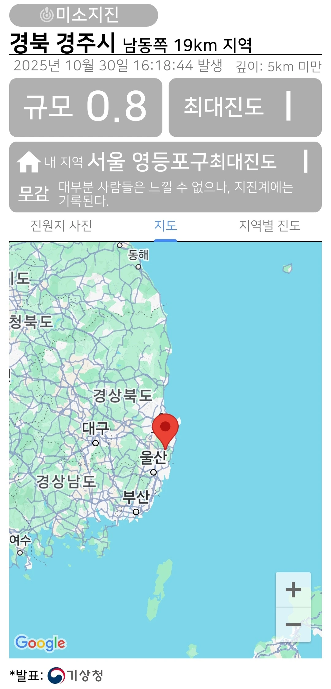 2025년 10월 30일 경북 경주시 남동쪽 19km 지역, 깊이 5km 미만에서 규모 0.8, 최대진도 I의 미소지진이 발생했습니다.