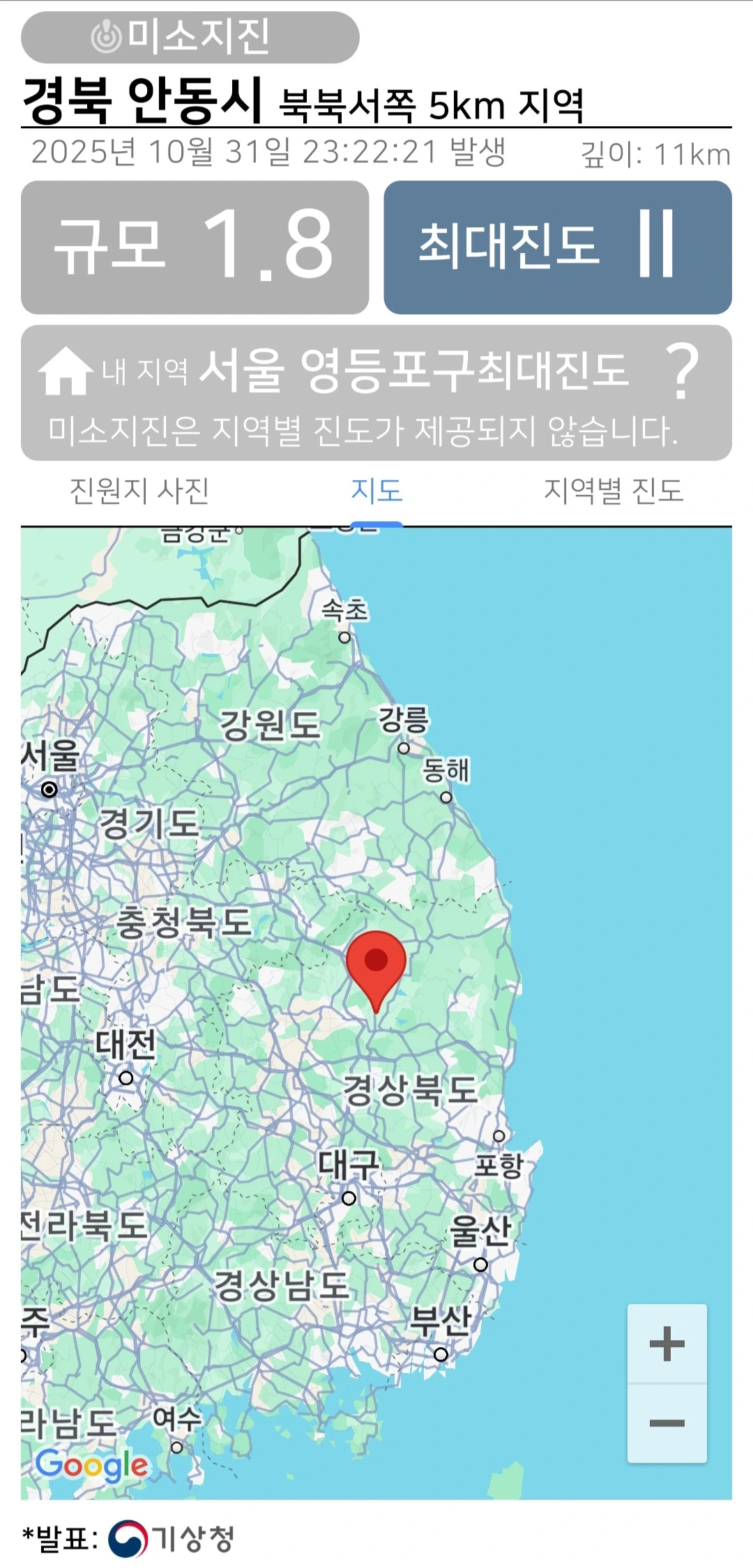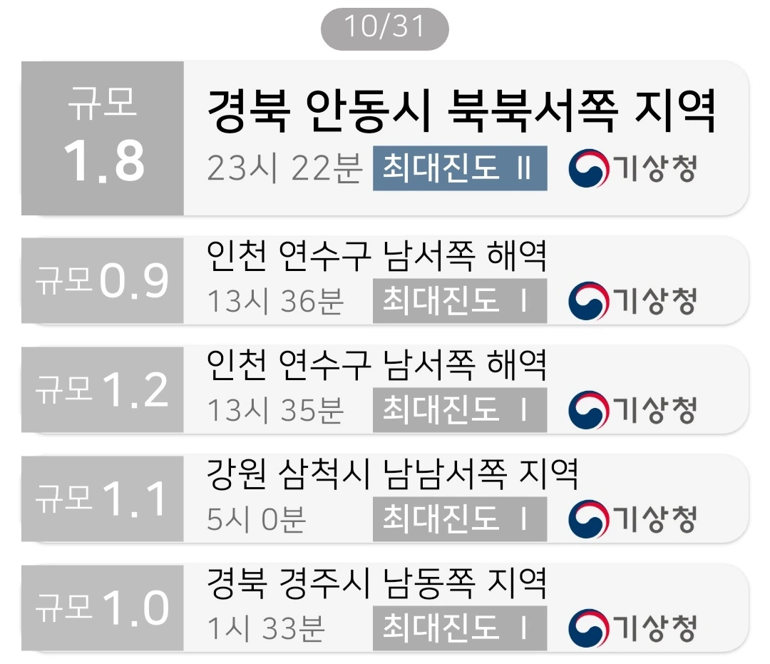 첨부된 이미지들이 보여주듯, 2025년 10월 31일 하루에만 경북 경주시, 강원 삼척시, 인천 연수구 해역, 그리고 경북 안동시 등 한반도 곳곳에서 미소지진(Microearthquake)이 발생했습니다.
