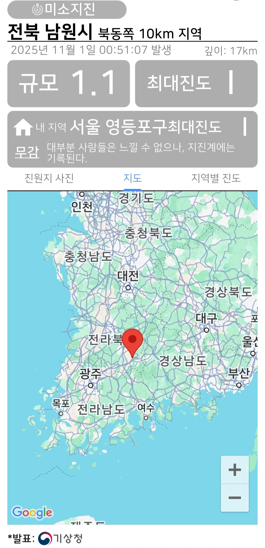사진 속, 전북 남원시 북동쪽 10km 지역에서 발생한 규모 1.1의 미소지진은 마치 깊은 잠 속에서 꾸는 짧은 꿈처럼 고요합니다.
