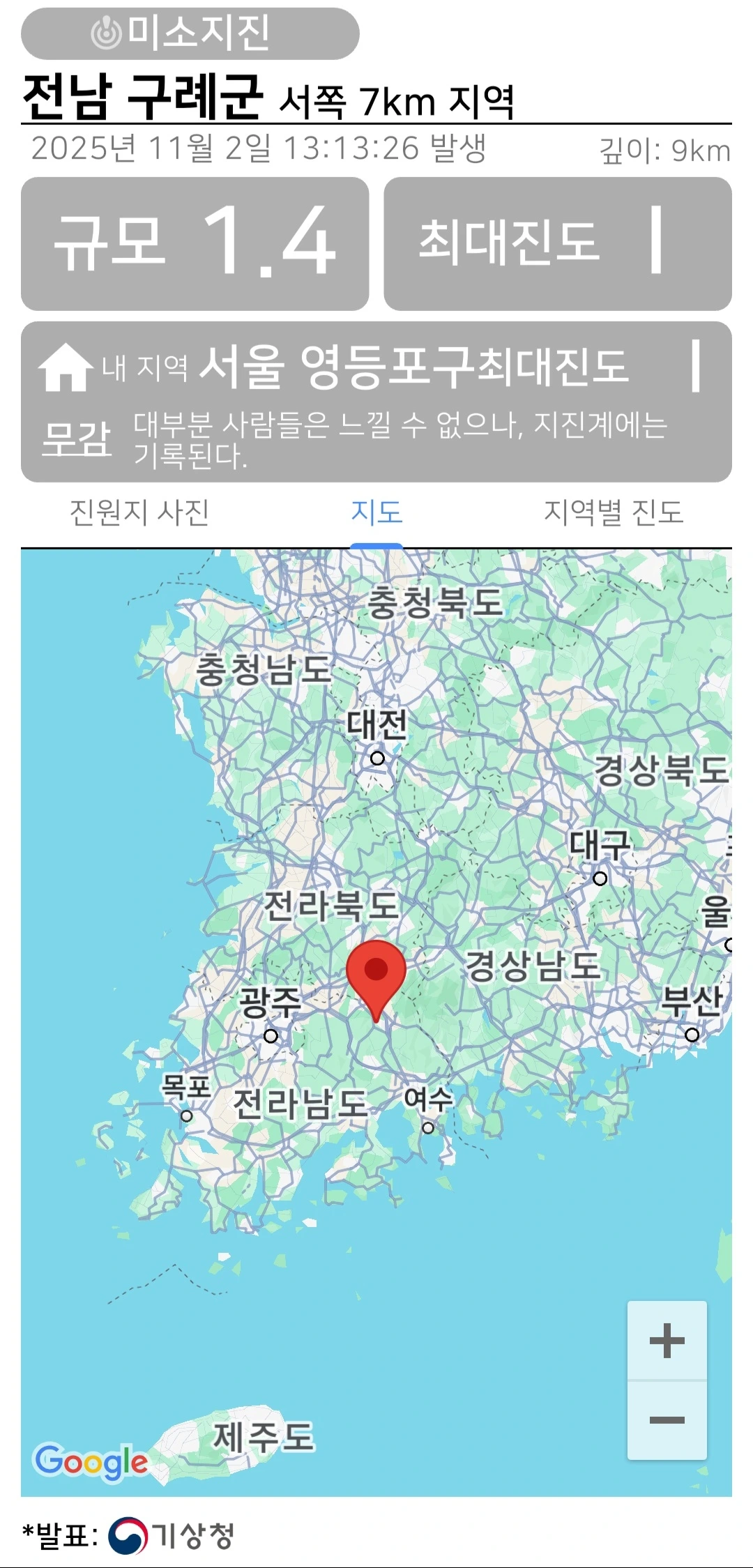 2025년 11월 2일, 오후의 정적을 깨고 전남 구례군 서쪽 7km에서 규모 1.4의 아주 작은 떨림이 기록되었습니다.