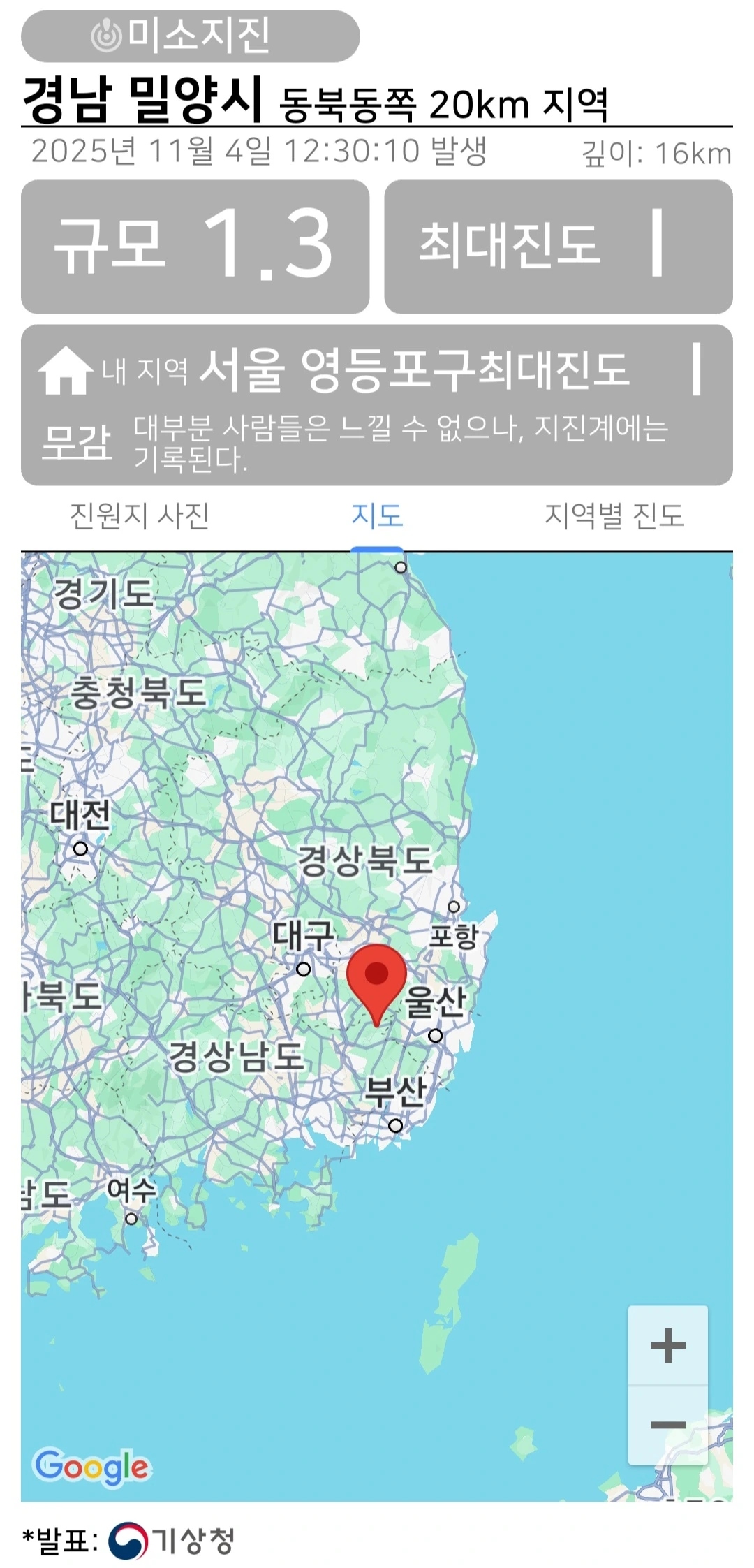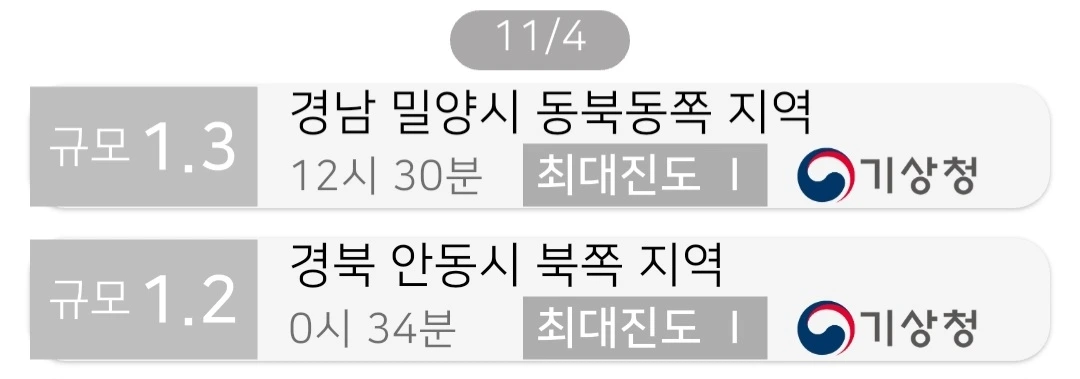 사진 속, 11월 4일 새벽과 낮에 기록된 경남 밀양시와 경북 안동시의 지진은 규모 1.3과 1.2. 이는 사람이 거의 느낄 수 없거나, 아주 조용한 상태에서만 일부가 감지할 수 있는 '미소지진'입니다.