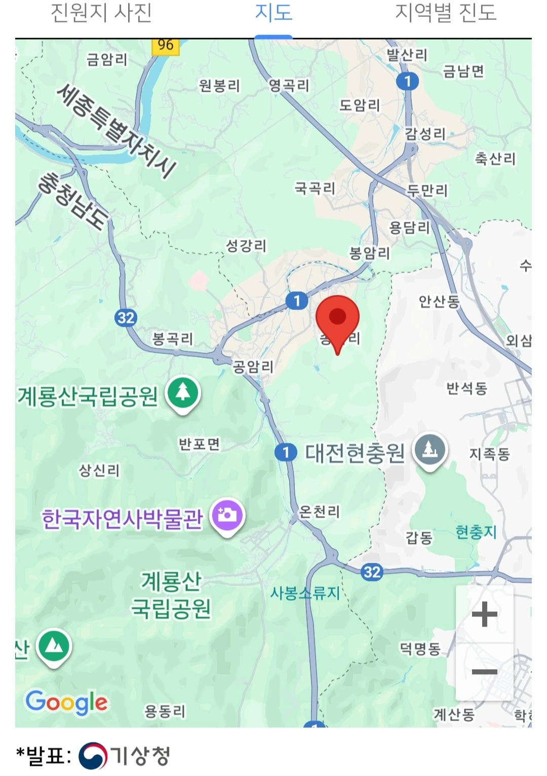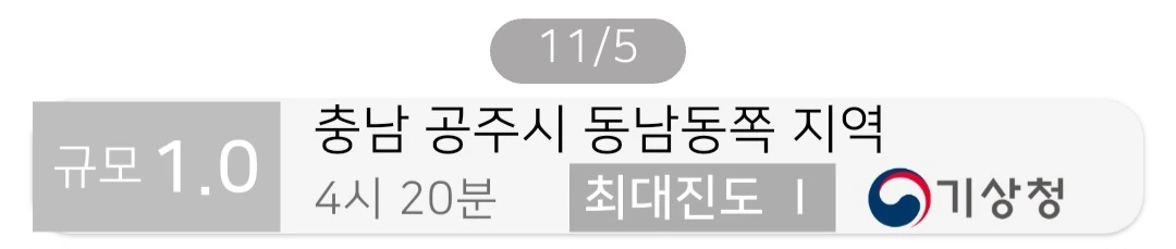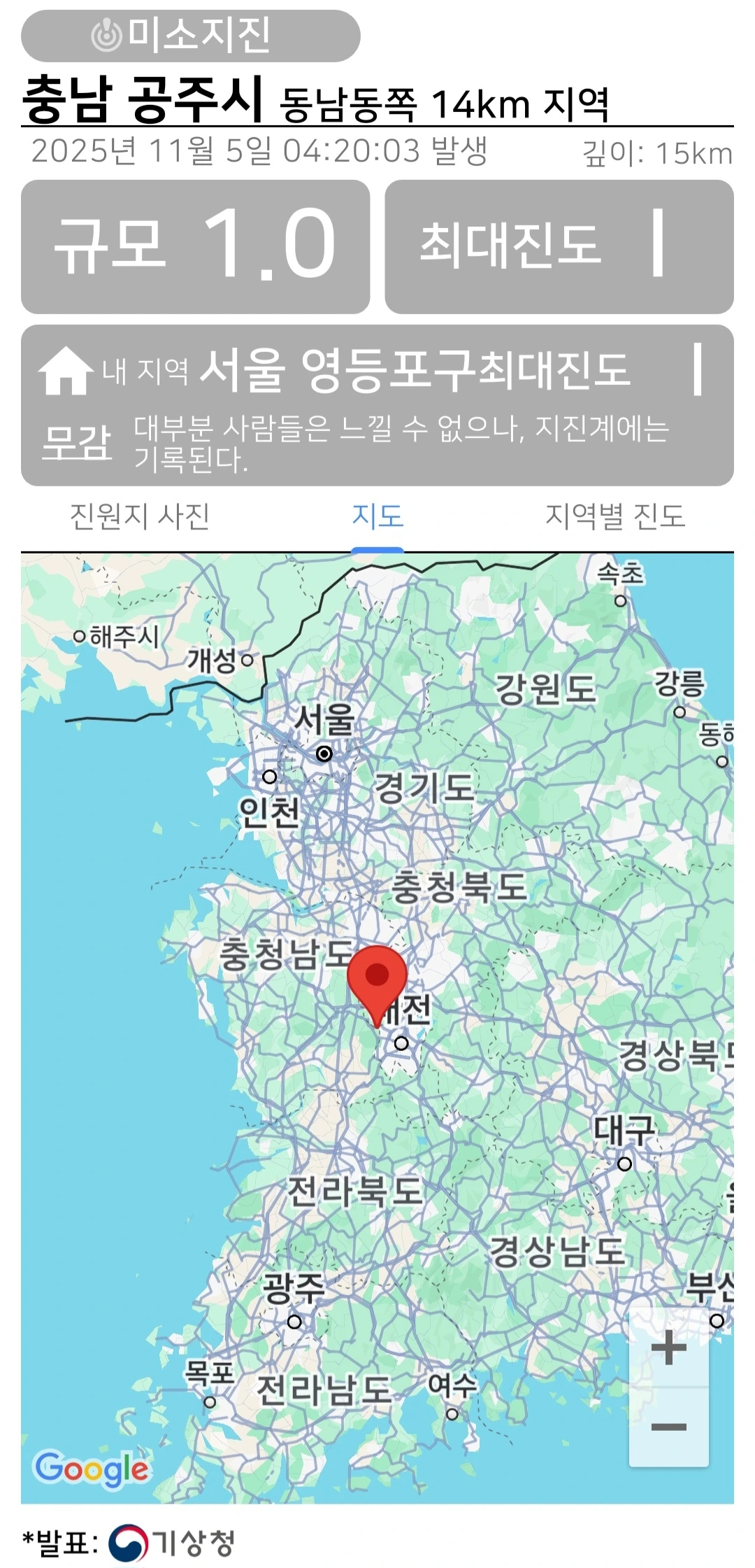 사진 속 충남 공주시 동남동쪽에서 발생한 규모 1.0 지진도 그중 하나입니다.