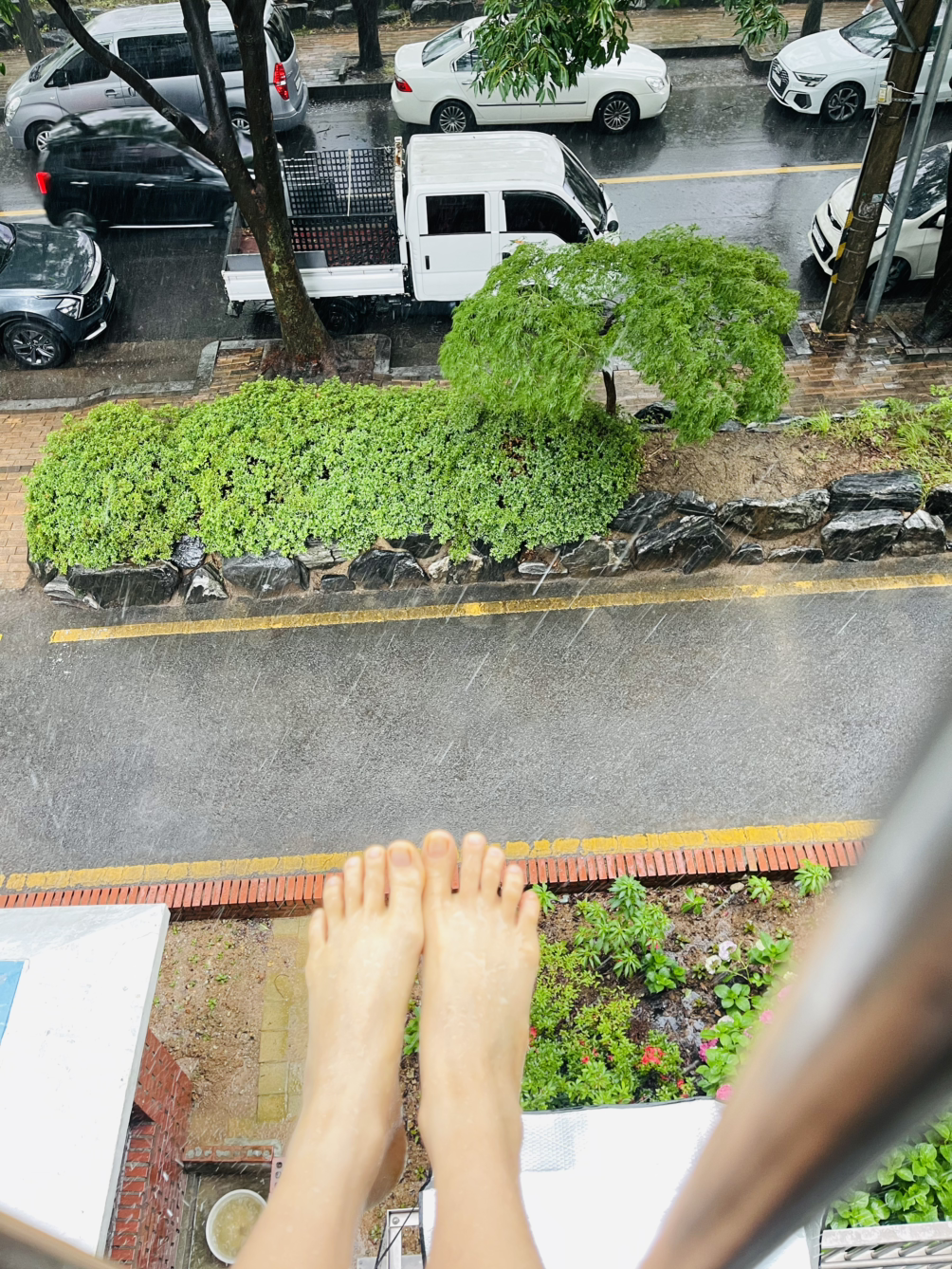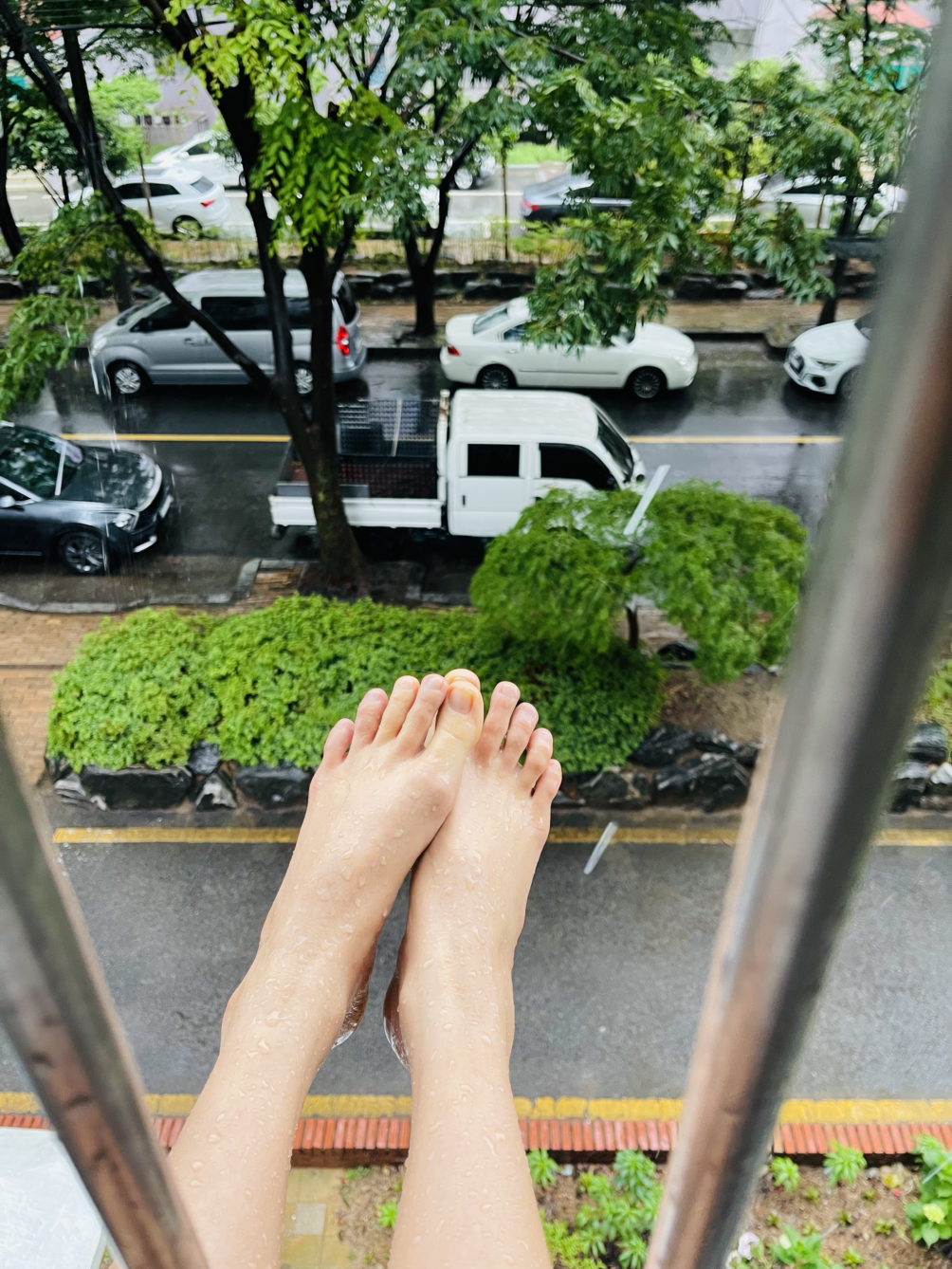 흘러내리는 빗물을 맞으며