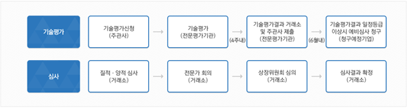 한편, 기술특례 상장에서 기술 평가를 통해 일정 등급 이상을 받아야 상장 예비 심사 청구 자격이 부여되기 때문에 기술 평가가 상당히 중요합니다. 따라서, 기술 평가 절차에 대해서 좀 더 자세히 살펴보겠습니다.