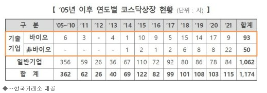 한국 거래소가 2022년 1월 24일에 발표한 자료에 따르면 2021년 말까지 143개사(바이오 기업: 93개, 비바이오 기업: 50개)가 기술특례 상장 제도를 통해 코스닥 시장에 상장되었다고 합니다.