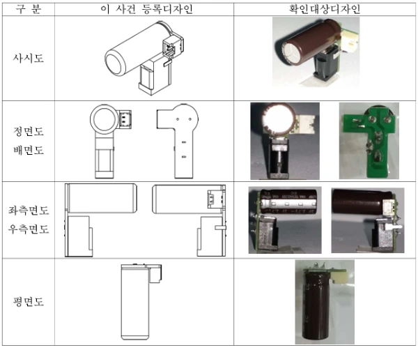 ㉮ 이 사건 등록디자인은 커패시터의 전면이 분할선 등으로 분할되지 않고 평평하고, 원통에 홈이 없는 데 비하여, 확인대상디자인은 커패시터의 전면이 얇게 파인 분할선에 의하여 동일한 크기의 3개의 부채꼴 형상으로 분할되고, 원통 중 인쇄회로기판에 인접한 부분에 오목한 홈이 형성되어 있는 점, ㉯ 이 사건 등록디자인은 모터단자의 접속단자가 끼워지는 개구부가 정면을 향하고 있고, 개구부에 접하는 면의 한쪽 모서리가 ‘ㄱ’ 형태로 파여 있는 데 비하여, 확인대상디자인은 모터단자의 접속단자가 끼워지는 개구부가 측면을 향하고 있고, 개구부 반대면의 한쪽 모서리가 ‘ㄱ’ 형태로 파여 있는 점, ㉰ 이 사건 등록디자인은 DC전원단자의 정면 중앙부의 측면만 원형으로 처리되어 있고, DC전원단자의 기판연결핀(아래 도면의 빨간색 부분)이 긴 직사각형의 형상인 데 비하여, 확인대상디자인은 DC전원단자의 정면 중앙부의 전체가 원형으로 처리되어 있고, DC전원단자의 기판연결핀이 정사각형과 긴 직사각형을 연결한 형상인 점, ㉱ 이 사건 등록디자인은 인쇄회로기판의 ‘ㄱ’자의 굴곡부가 커패시터의 형상을 따라 원형으로 처리되어 있는 데 비하여, 확인대상디자인은 인쇄회로기판의 ‘ㄱ’자의 굴곡부가 직사각형이 교차한 형상으로 되어 있는 점에서 차이가 있다.