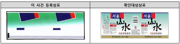 반면 확인대상상표는 전체적으로 직사각형의 형태를 가지되, 상단에는 남색의 가는 띠가, 하단에는 남색의 매우 가는 띠와 금색의 띠가 각각 횡으로 그어져 있고, 그 중앙 부분에는 하늘색과 흰색의 바탕을 배경으로 상부에는 남색과 주황색으로 이루어진 직사각형 2개 및 그 아래로 주황색의 작은 직사각형 2개가 배치되며 가운데 부분에는 흰색의 직사각형 1개가 배치되어 있는 모양의 도형을 기본 바탕으로 하면서, 위 도형 중 남색과 주황색으로 이루어진 직사각형 2개에는 각각 “서울”이라는 글자가 크게 씌어져 있고, 그 우측 하단에는 각각 “山水”, “서울쌀막걸리”라는 글자가 크게 씌어져 있으며, 그밖에 작은 글씨로 제품설명, 원재료, 사용방법, 경고문, 상호 및 전화번호 등의 글자가 위 도형 곳곳에 기재되어 있음을 알 수 있는바, 확인대상상표를 구성하고 있는 도형 부분과 문자 부분의 크기 및 배치 관계, 문자 부분의 내용 등을 모두 고려하여 볼 때 확인대상상표는 기본 바탕을 이루는 도형 부분과 그 위에 큰 글씨체로 씌어진 “서울“, ”山水”, “서울쌀막걸리”라는 각 문자 부분의 결합에 의하여 구성된 표장으로 보아야 할 것이고, 나머지 문자 부분 등은 그 내용에 비추어 상표를 구성하는 요소로는 보이지 않는다.