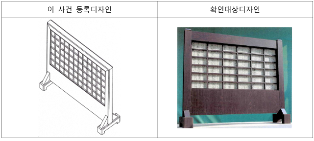 양 디자인은 전체적으로 가로가 긴 직사각형 모양으로서, 직사각형의 내부에 일정한 굵기의 문살을 가로, 세로로 여러 개 교차∙형성하여 격자모양을 이루고 있고, 전체 직사각형 모양 중 격자모양을 제외한 둘레부분을 보면, 좌우측 둘레부분의 폭은 서로 비슷하고 상하측 둘레부분의 폭은 하측이 상측보다 3배가량 더 넓은 모양으로 되어 있다. 그리고, 둘레부분이 일정한 두께를 가지고 있어 좁고 긴 직사각형 모양으로 보이고, 받침대를 살펴보면, 이 사건 등록디자인과 확인대상디자인이 서로 매우 비슷한 형상과 모양을 갖고 있다.