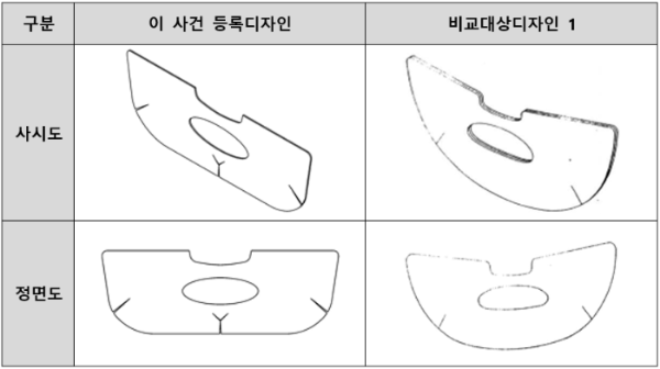 양 디자인은 모두 ① 전체적으로 사람의 얼굴의 아래 부분의 형상과 같이 되어 있는 점, ② 중앙에 입 형상의 구멍이 형성되어 있고, 상단에 콧구멍 노출을 위한 함몰부가 형성되어 있는 점, ③ 좌우측 하단 가장자리 좌우에 각각 절개선이 형성되어 있는 점 등의 지배적인 특징이 유사하다.