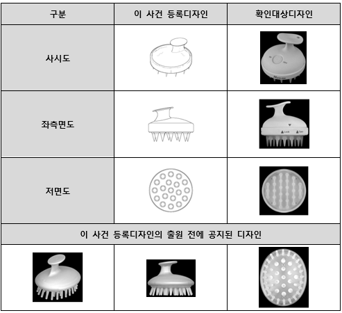 양 디자인은, ① 본체부는 낮은 원기둥의 윗부분에 고봉을 올렸거나 볼록거울을 올려놓은 듯한 형상이고, ② 손잡이는 볼록거울의 중앙에서 한쪽으로 치우친 부분에 세워져 있으며, 그 형상이 ‘π’자 형태이고, ③ 브러시 살은 옆 형상이 원뿔형인 점에서 유사하다. 그러나 이 사건 등록디자인의 출원 전에 공지된 디자인에서 보는 바와 같이, 위 디자인도 본체부의 윗부분이 볼록거울 형상으로 부풀어 올라 있고, 손잡이가 볼록거울 형상의 중앙에서 한쪽으로 치우친 부분에 세워져 있으며, 그 형상이 ‘π’자 형태이고, 일부 브러시 살의 옆 형상이 원뿔형이므로, 본체부에 낮은 원기둥이 있다는 점을 제외한 나머지 위 ①, ②, ③의 유사점은 그 중요도를 낮게 평가하여야 할 것이고, 확인대상디자인의 대상 물품이 브러시 살 부분을 본체부로부터 탈착할 수 있는 전동식 두피 마사지기로서 본체부와 브러시 살 부분을 탈착하기 위해서는 본체부나 브러시 살 부분 중 하나는 원기둥 형상으로 하고 다른 하나는 원기둥에 삽입되는 형상을 가질 필요가 있다고 보이므로, 본체부에 낮은 원기둥이 있다는 점 또한 유사여부를 판단함에 있어 그 중요도를 높게 평가할 수 없다.