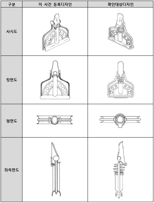 이 사건 등록디자인은 작동대의 아래 부분에 큰 홈이 있는 형상이고, 확인대상디자인은 작동대의 아래 부분이 돌출된 형상이다. 이 사건 등록디자인은 고정판 중앙의 끼움봉이 스프링 없이 작동대와 연결되어 있고 고정레버까지 같은 크기로 길게 뻗어 반원 형태로 결합되어 있는 형상인 반면, 확인대상디자인은 고정판 중앙의 끼움봉이 그 상부에 설치된 스프링을 통하여 작동대와 연결되어 있고 끝부분이 급격히 가늘어져서 가는 막대 형태로 고정레버와 연결되어 있어서 끼움봉의 길이가 이 사건 등록디자인의 끼움봉에 비하여 짧다. 이 사건 등록디자인은 고정판이 반원 모양이어서 그 테두리에 반원 모양의 두 줄의 보강 띠가 있고 그 보강 띠 사이의 고정판에는 좌우에 3개씩의 동일한 크기의 구멍이 형성되어 있는 반면, 확인대상디자인은 고정판이 각이 진 모양이어서 그 테두리에 각이 진 모양의 두 줄의 보강 띠가 있고 그 보강 띠 사이의 고정판에는 좌우에 3개씩의 큰 구멍과 1개씩의 매우 작은 구멍이 있는데 3개의 구멍의 크기는 위에서 아래로 조금씩 커지고 매우 작은 구멍이 가장 큰 구멍의 둘레에 붙어 있으며 보강 띠와 접하고 있는 형상이다. 이 사건 등록디자인은 결착대의 하단 평행부가 보이지 않는데 반해, 확인대상디자인은 결착대의 하단 평행부의 일부분이 외부에서 보이는 형상인 점에서 차이가 있다.