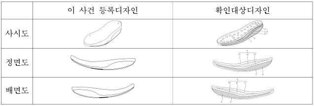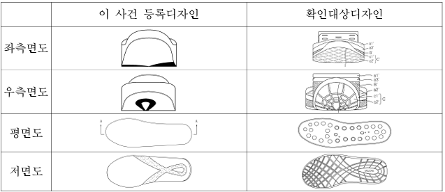 두 디자인은, ㉲ 이 사건 등록디자인의 좌측면이 하나의 창(sole)으로 보일 정도로 단조로운 모양인 반면, 확인대상디자인의 좌측면은 다수의 창(sole)이 쌓여진 다층구조의 모양으로 표면에 그물처럼 수많은 선형 홈의 형상을 가지고 있고, ㉳ 이 사건 등록디자인의 우측면이 팽이모양의 형상을 가지고 있는 반면, 확인대상디자인의 우측면은 거미줄 모양의 선형 홈의 형상을 가지고 있으며, ㉴ 이 사건 등록디자인의 평면이 아무런 무늬가 없는 반면, 확인대상디자인의 평면은 다수의 구멍이 뚫어진 모양을 가지고 있고, ㉵ 이 사건 등록디자인의 저면이 1개의 리본모양의 띠가 형성되어 있는 반면, 확인대상디자인의 저면은 복잡하게 얽혀 있는 그물구조의 선형 홈이 형성되어 있는 점 등에서 차이가 있다.