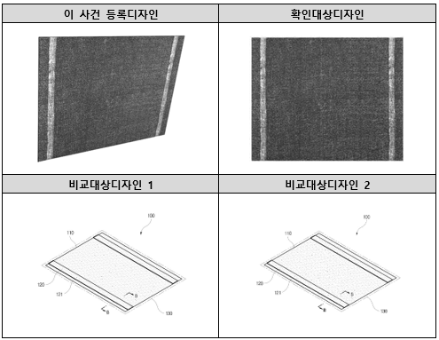 다만, 확인대상디자인은 육안으로 볼 때에 면상발열체의 직물이 비교적 촘촘히 직조되어 있음을 관찰할 수 있는데 반해서, 비교대상디자인 1, 2는 도시된 내용만 가지고는 직물의 촘촘한 정도를 육안으로 확인하기 어려운 차이가 있다.