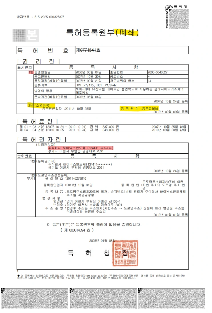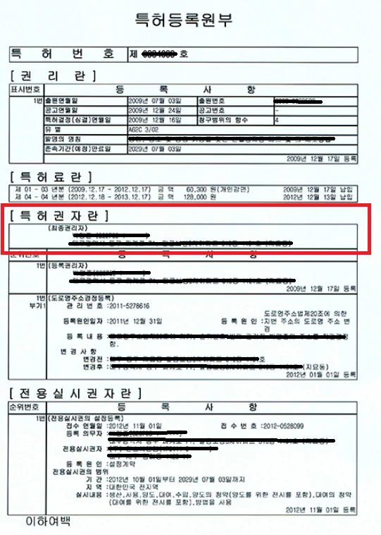 특허청 등록원부를 통해 특허권자 명의를 확인합니다.