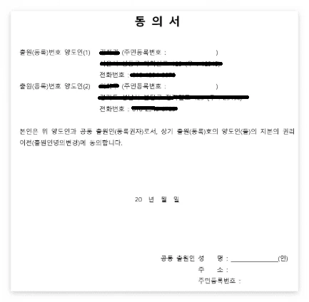 권리자가 복수인 상태에서 일부 권리자의 지분만 이전 받는 경우 다른 권리자의 동의서를 반드시 제출해야 합니다.