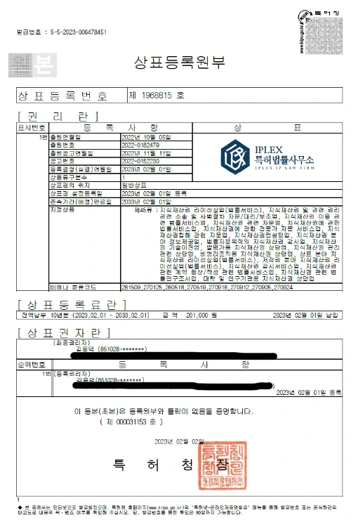 아이피렉스 특허법률사무소는 다수의 권리이전 대리 업무 사례를 바탕으로 안전한 권리이전을 진행합니다. 아이피렉스 특허법률사무소를 통해 진행하시면 등록원부(현재 권리자, 이전 권리자 정보가 기재된 서류)를 발급받아 권리 소멸여부, 상표권 소유권자 등을 확인하여 권리이전 시 문제가 발생하지 않도록 도움을 드리고 있으며, 권리이전 시 필요한 서류를 준비해 드립니다.